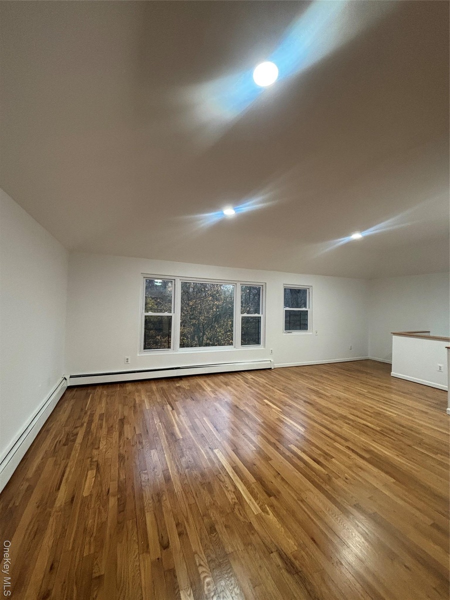 - Unfurnished living room featuring light wood-type flooring and a baseboard heating unit