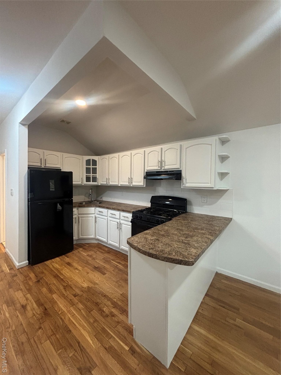 - Kitchen with lofted ceiling, dark countertops, fridge, white cabinets, and range