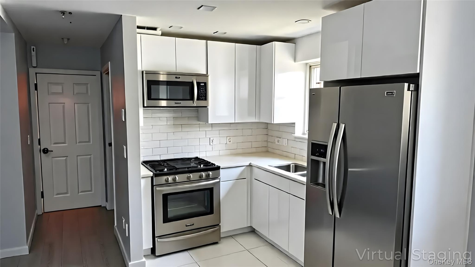 - Kitchen with appliances with stainless steel finishes, white cabinetry, decorative backsplash, modern cabinets, and light tile patterned floors