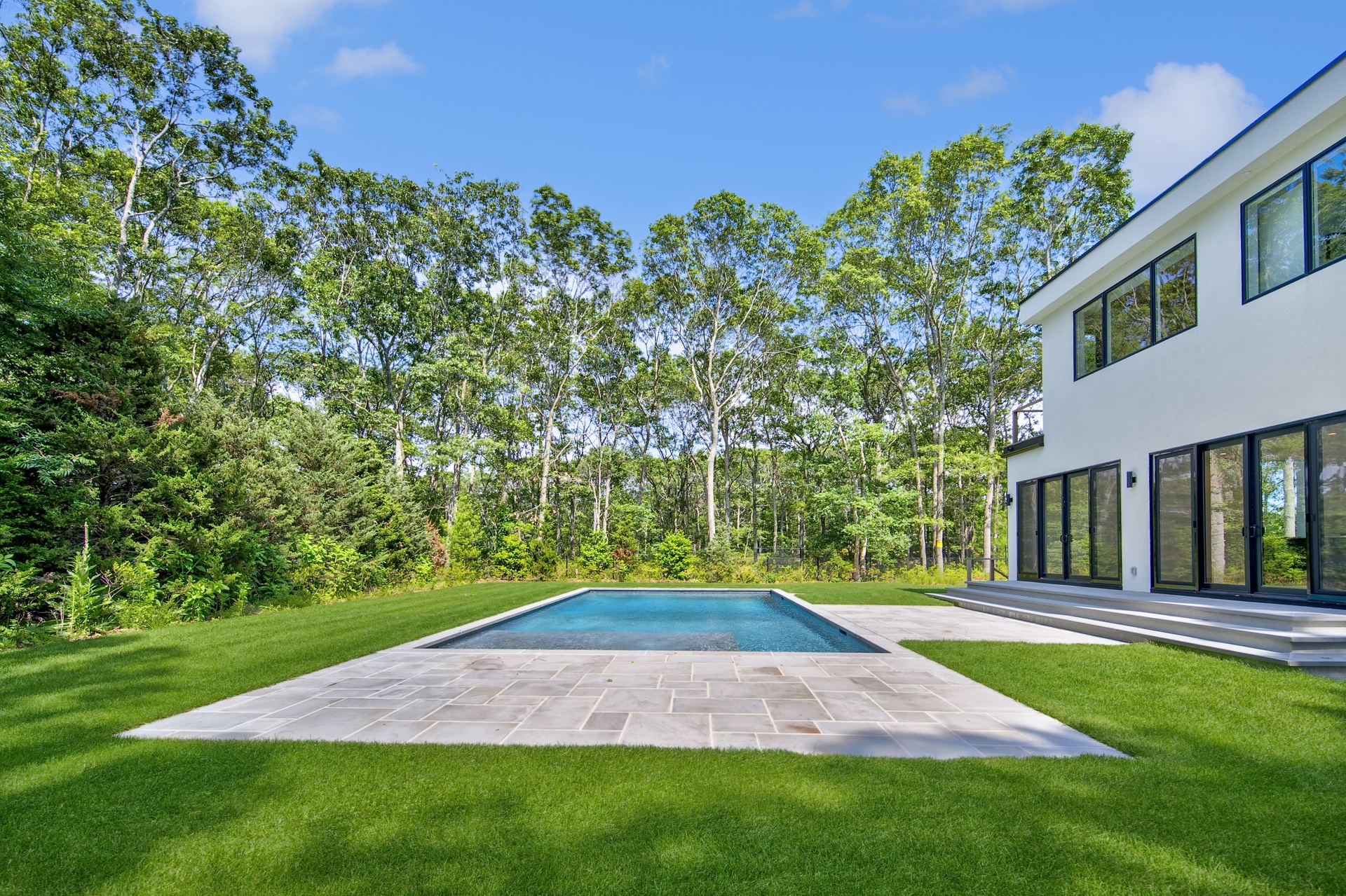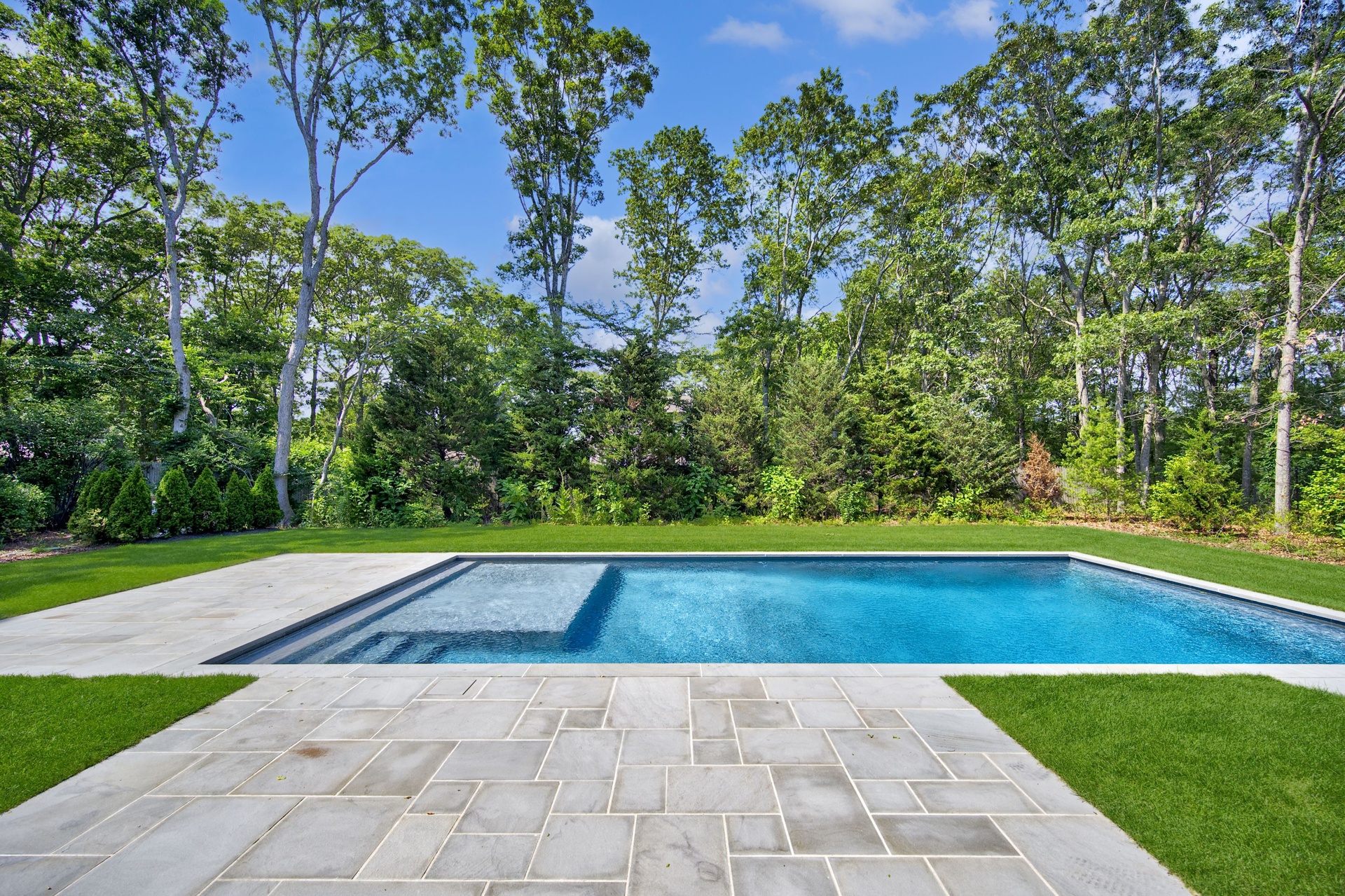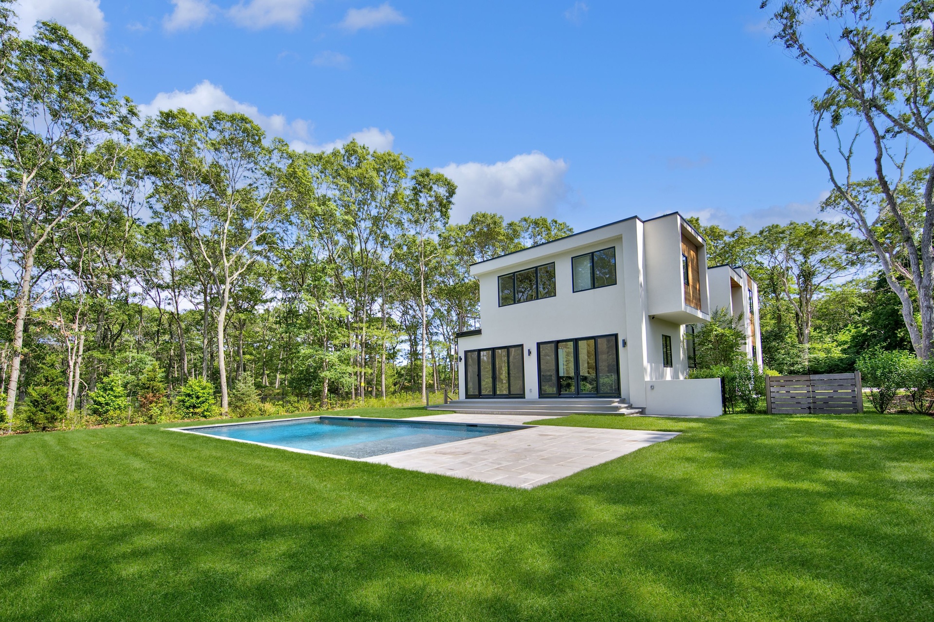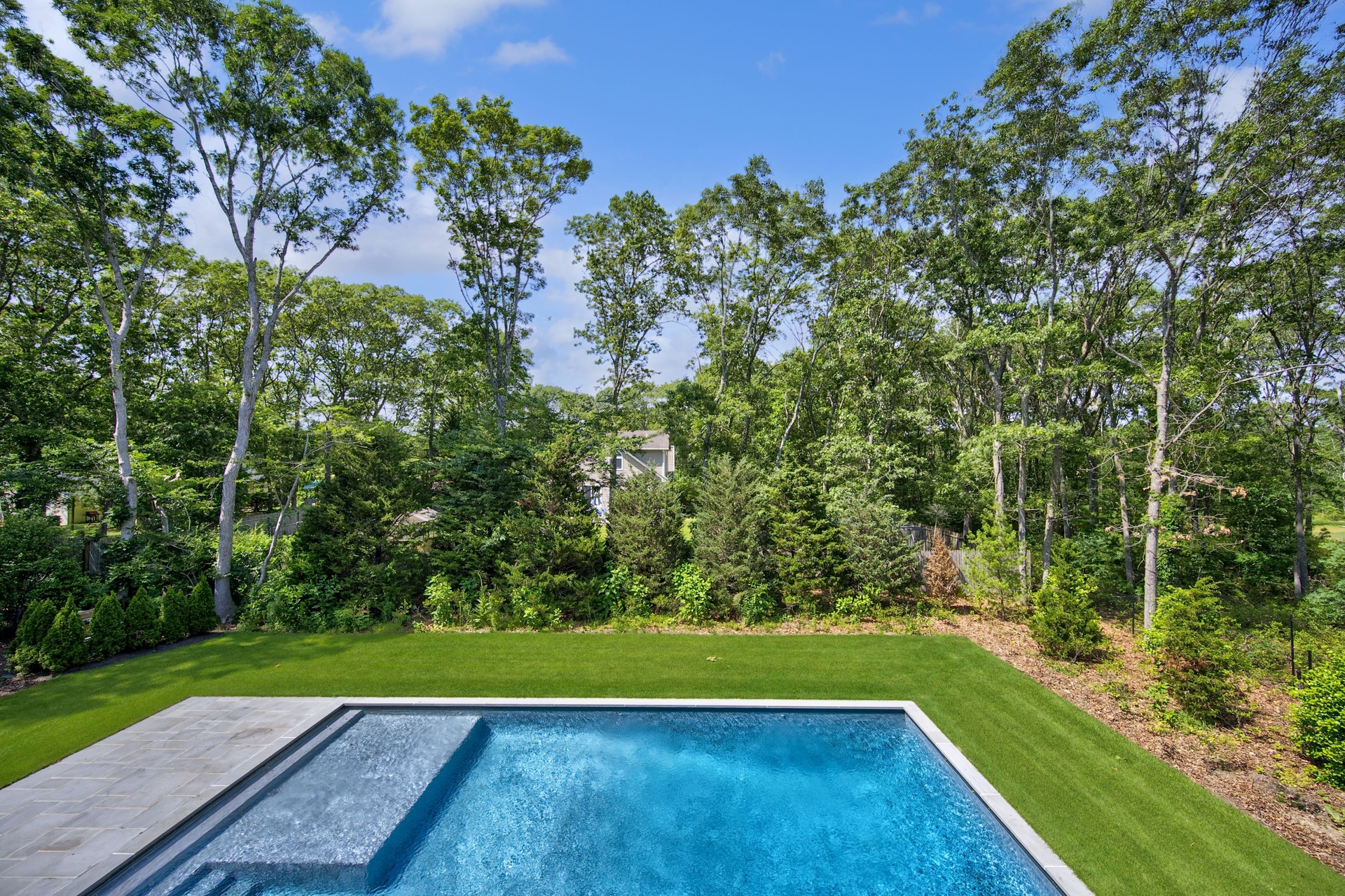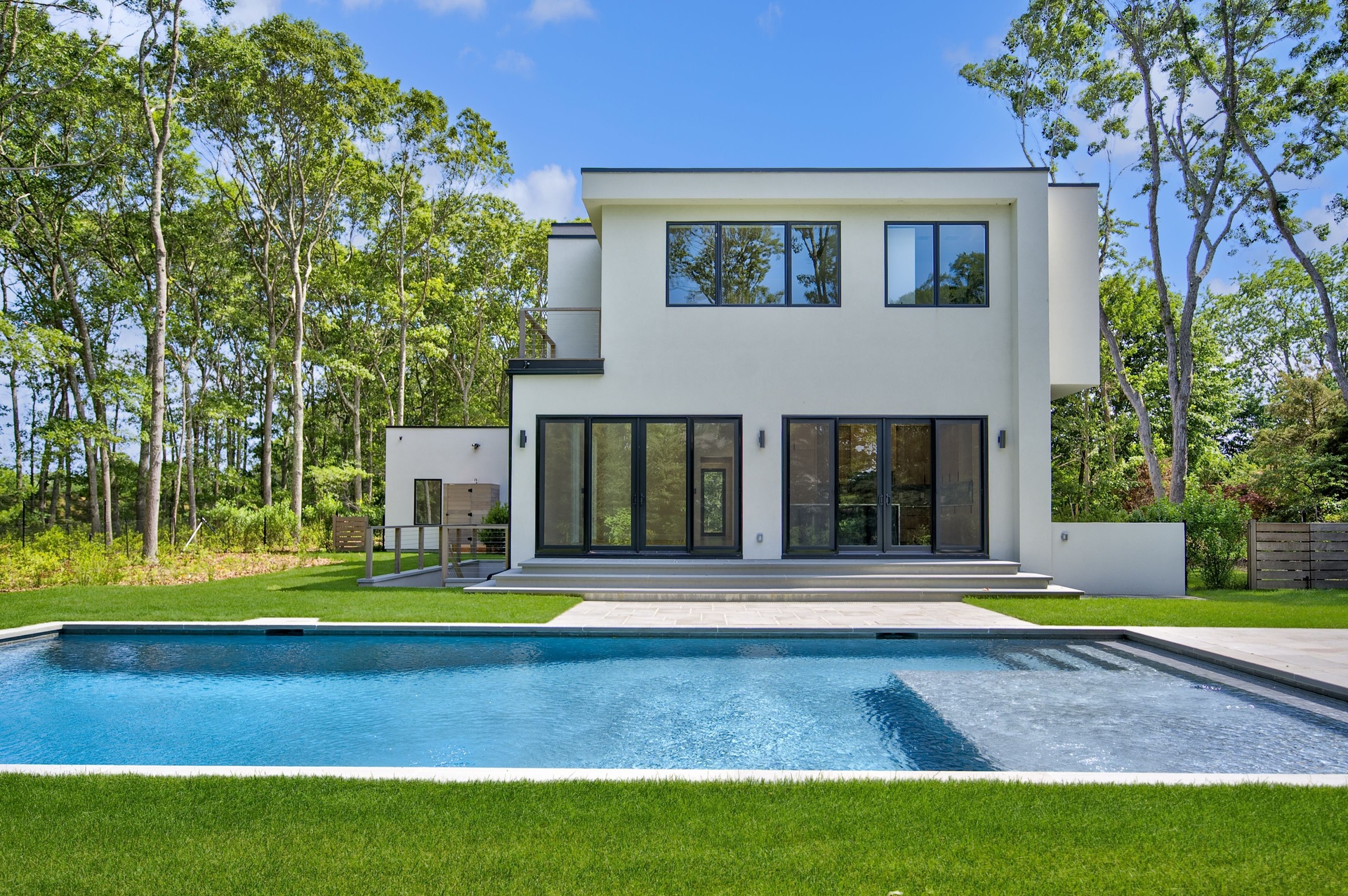 Tucked away down a private, tree-lined driveway in East Quogue, this stunning new Modern custom-built Hamptons-style home offers the ultimate in modern luxury and serene living. Overlooking the prestigious Hills Golf Course, the home features a beautifully appointed primary suite with a private balcony, offering sweeping views of the 20' x 40' heated Gunite pool and manicured grounds. Two additional spacious en-suite bedrooms are located on the second level, each thoughtfully designed for comfort and privacy. The main level is perfect for entertaining, featuring a gracious great room with a fireplace, a custom chef's kitchen with premium appliances, an office and a junior primary suite. A stylish powder room completes the space. The expansive lower level offers a generous recreational room with direct walk-out access to the bluestone patio, pool area, and lush landscaping. This level also includes a temperature-controlled wine room, wet bar, an additional en-suite bedroom, and a flexible bonus room ideal for a gym, home theater, or studio. Functional design with soft, elegant accents and high-end finishes throughout, this home is a true retreat. Conveniently located just minutes from the best of the Hamptons-beaches, villages, shops, and renowned restaurants-with easy access to Route 27 for seamless travel. Enjoy more time with friends, family, and the fairways-all from the comfort of your own East Quogue sanctuary.