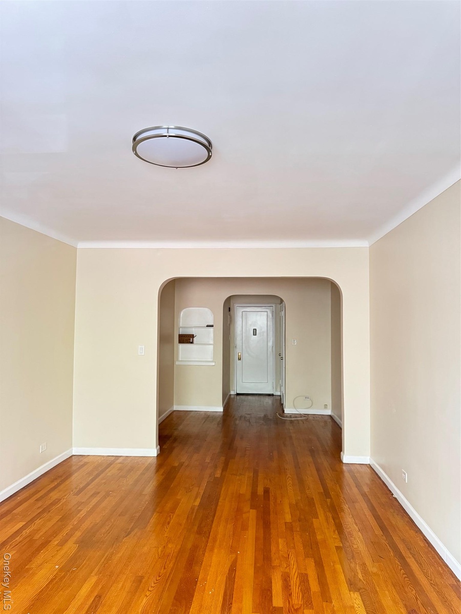 - Empty room with arched walkways, wood finished floors, radiator heating unit, and ornamental molding