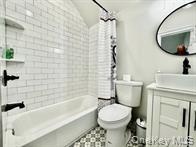 - Bathroom with shower / bath combo with shower curtain, vanity, and vaulted ceiling