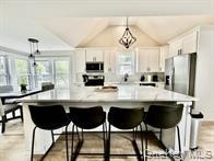 - Kitchen featuring white cabinets, appliances with stainless steel finishes, lofted ceiling, a large island, and decorative light fixtures