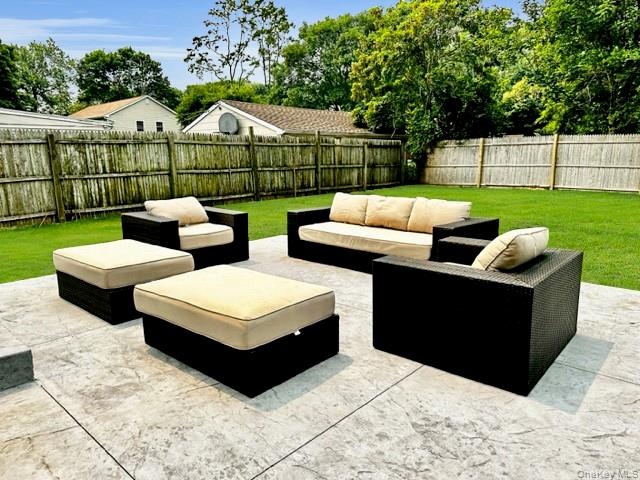 - Fenced backyard featuring an outdoor living space and a patio area