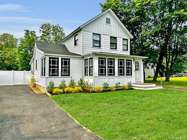 - View of front of property with driveway, board and batten siding, a front yard, and a gate