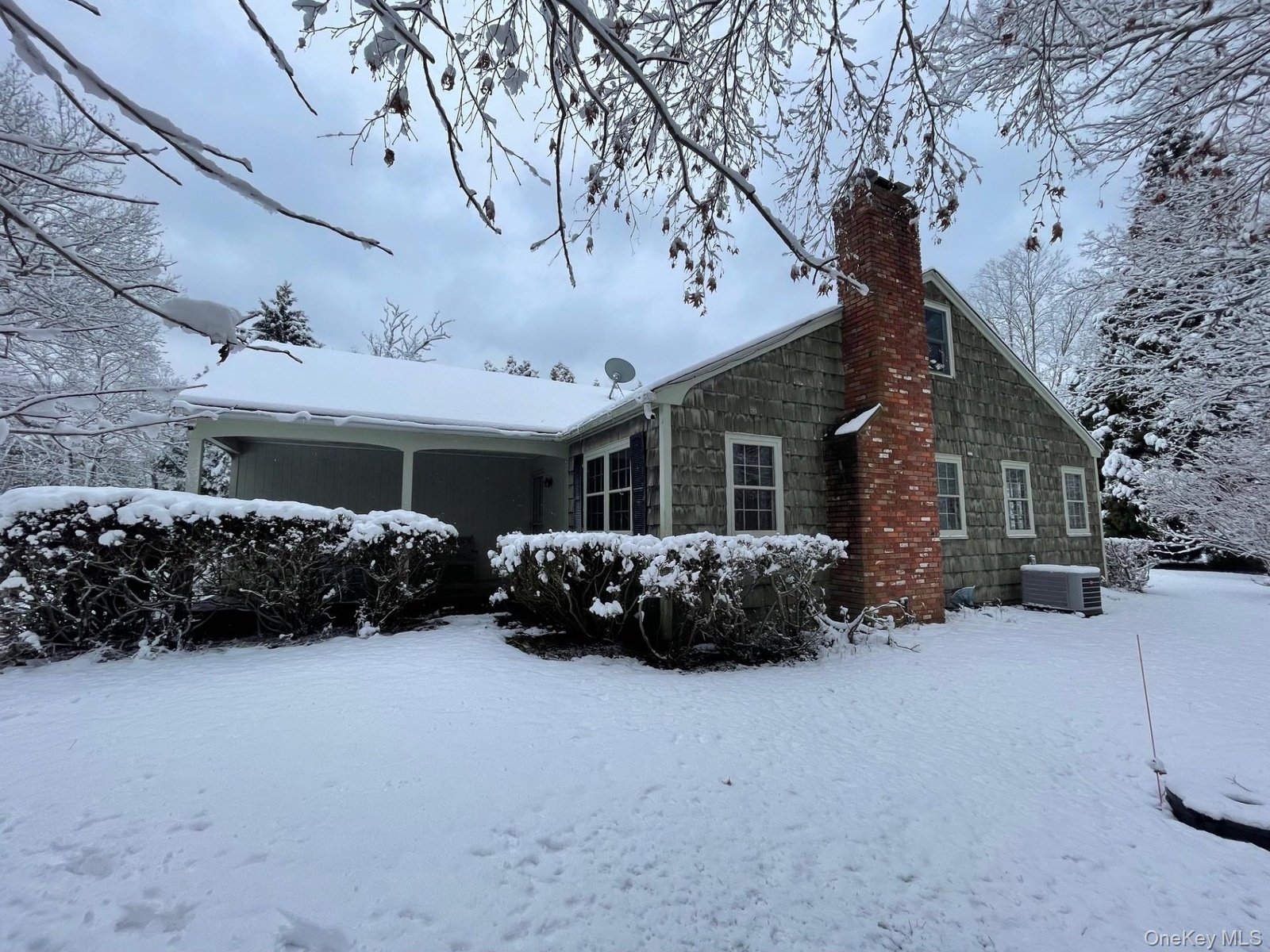 - View of snow covered exterior featuring a chimney and a cooling unit