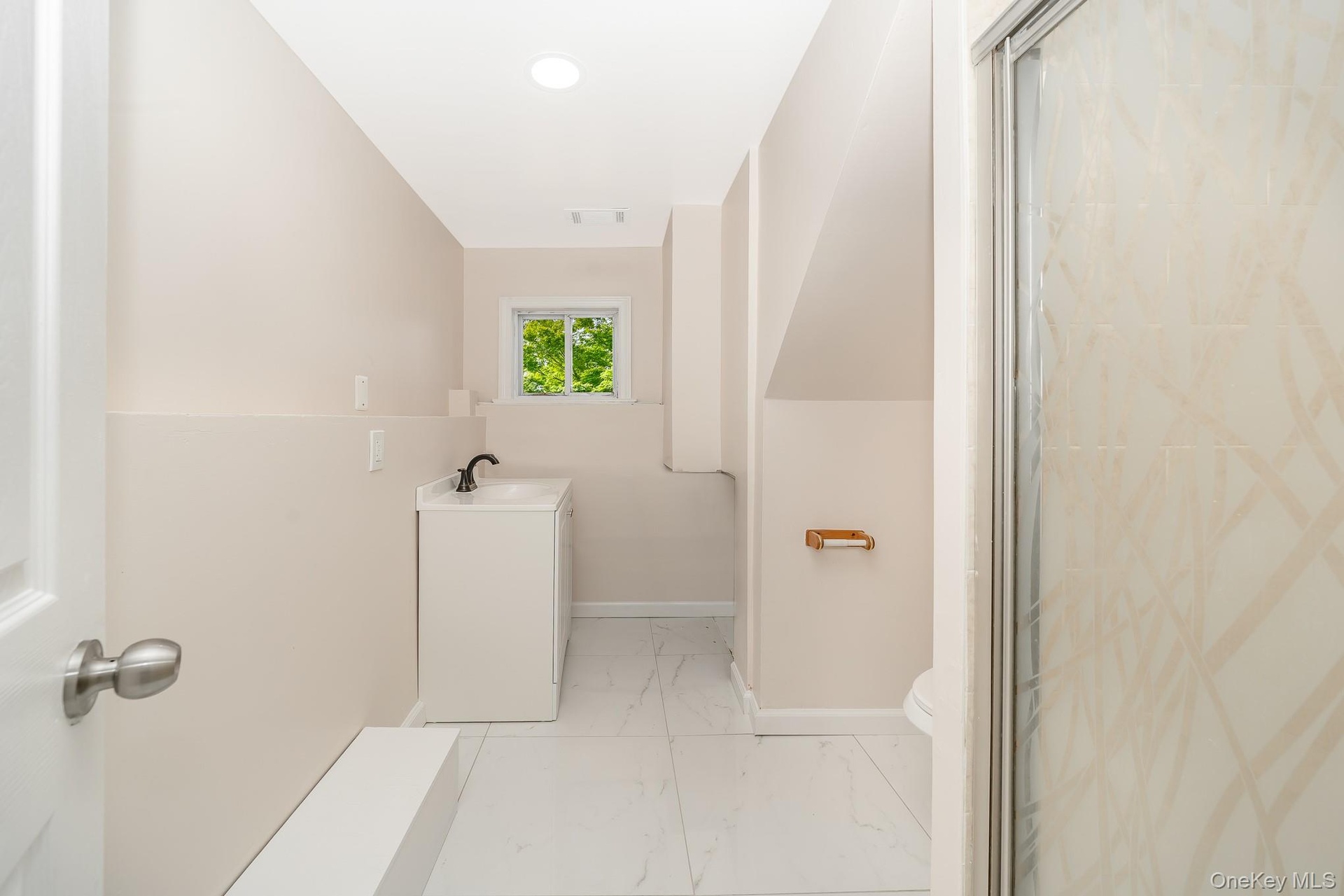 - Bathroom featuring vanity, light marble finish floors, and a stall shower