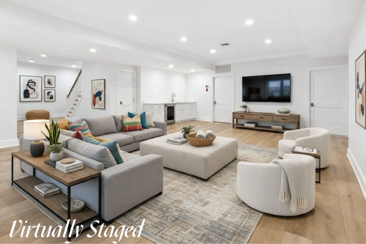 The finished lower level offers versatile living space, featuring a spacious recreation room, two additional bedrooms, a stylish mini bar, and a second laundry room.