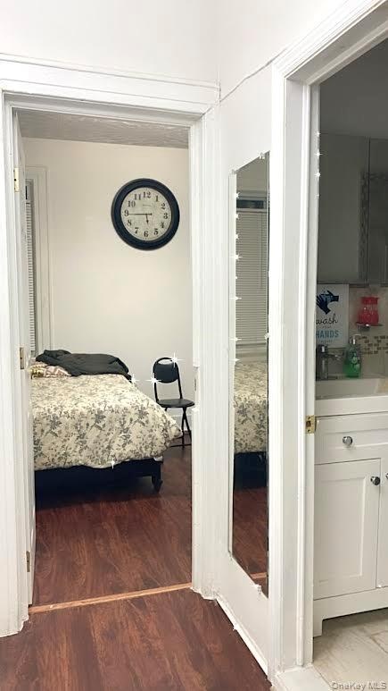 - Kitchen featuring white cabinetry, dark wood-type flooring, light stone countertops, and a textured ceiling