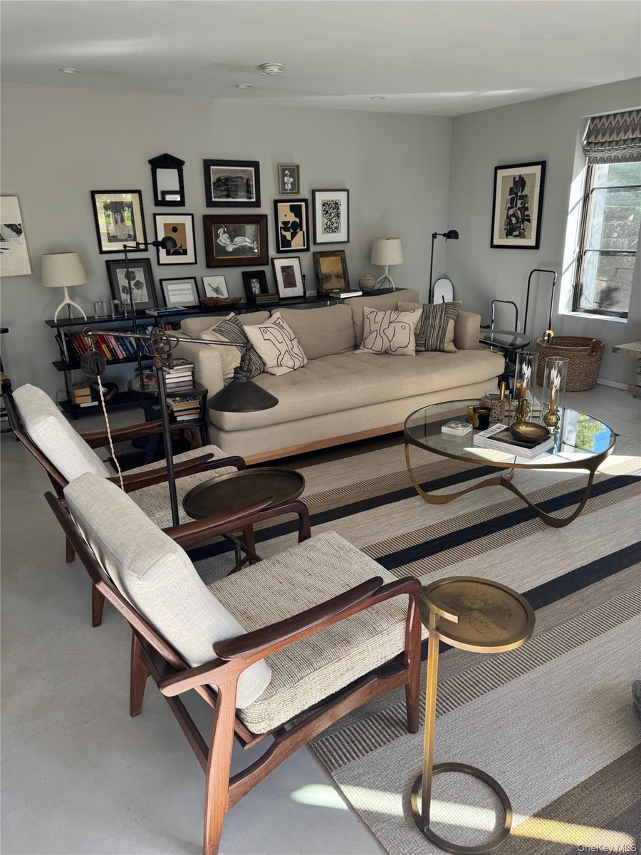 - Dining room with finished concrete floors and a wooden ceiling with exposed beams