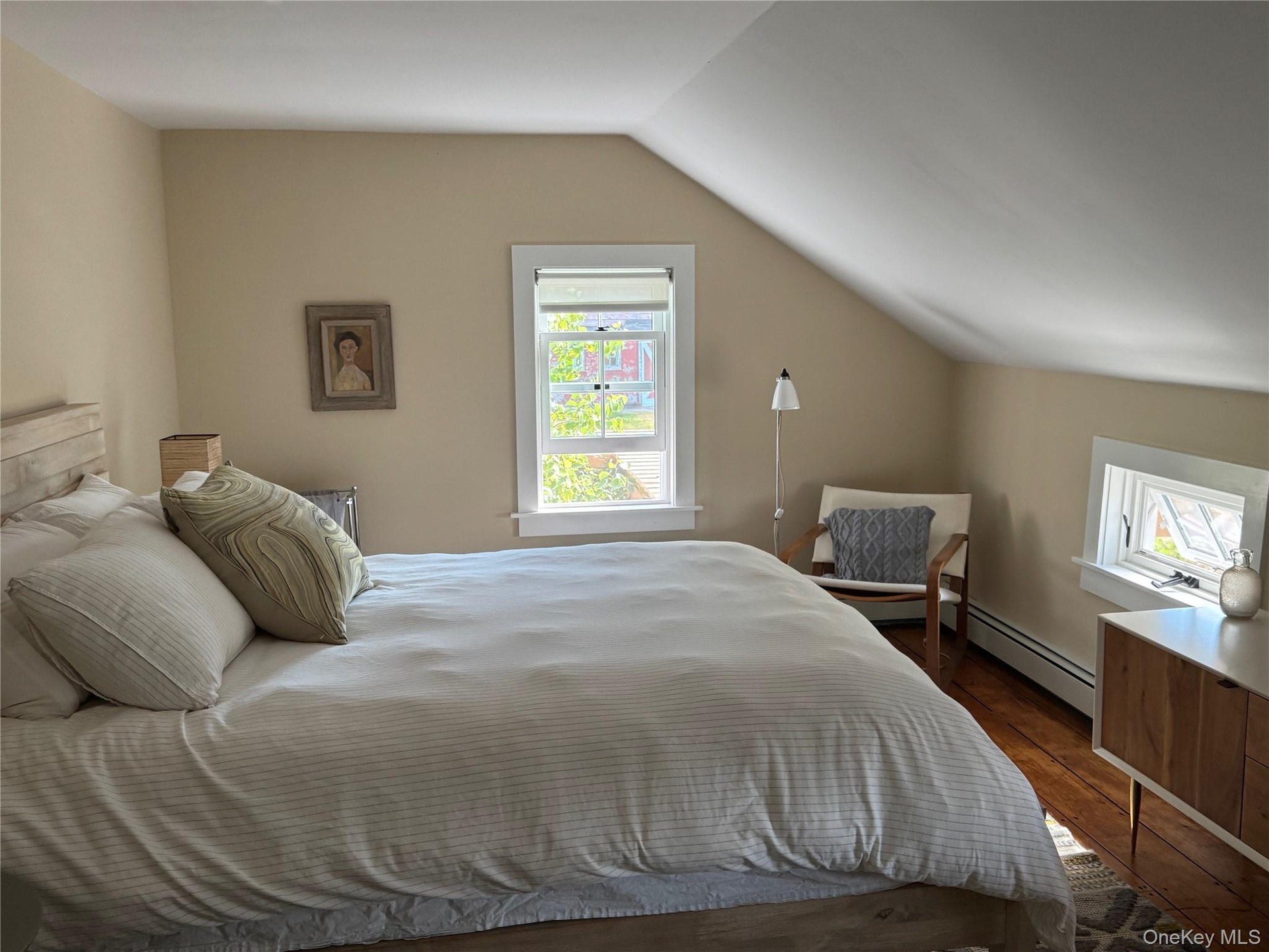 - Bedroom featuring vaulted ceiling, dark wood-style floors, and a baseboard radiator