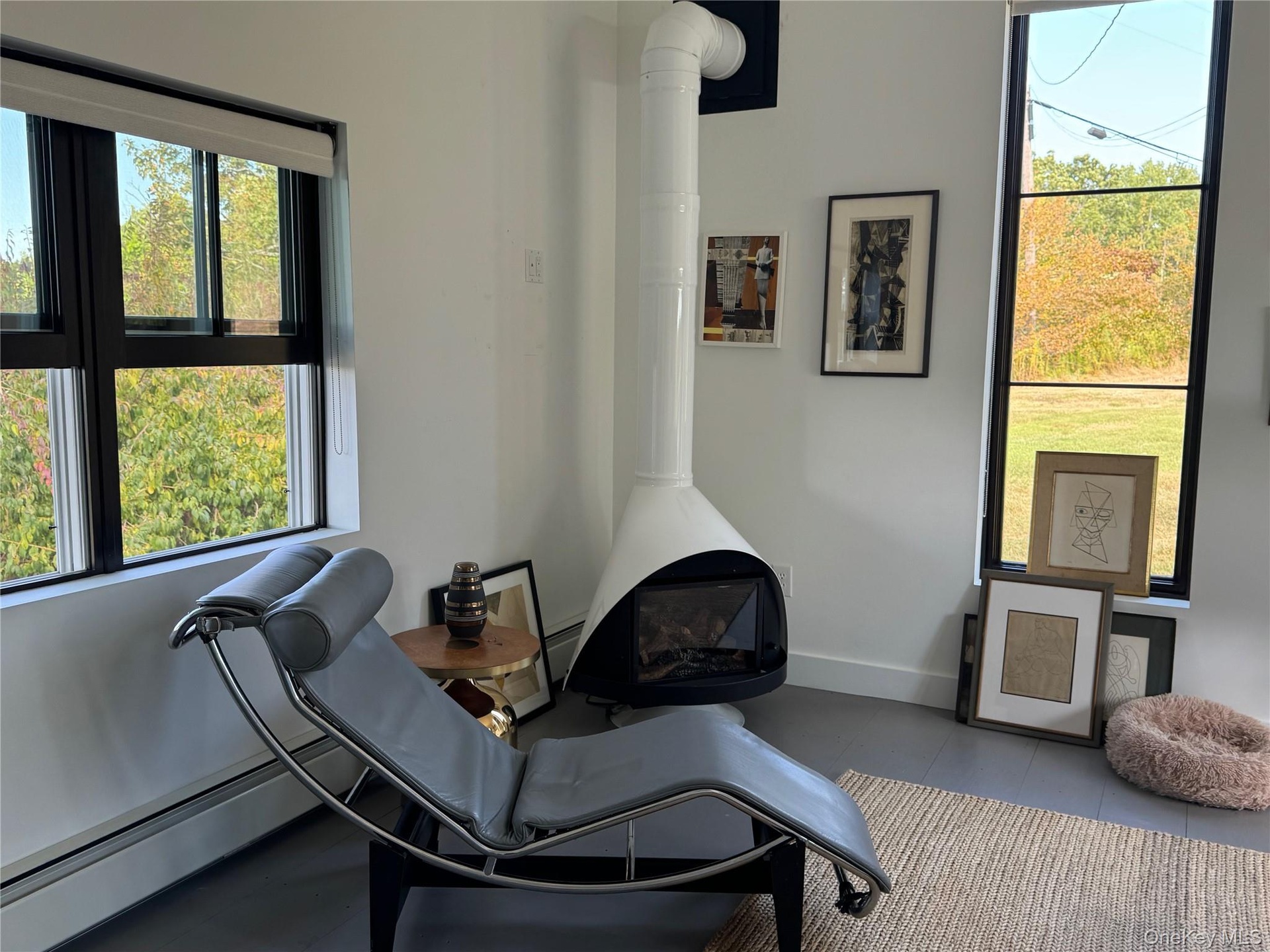 - Sitting room with a wood stove, a baseboard heating unit, and tile patterned floors