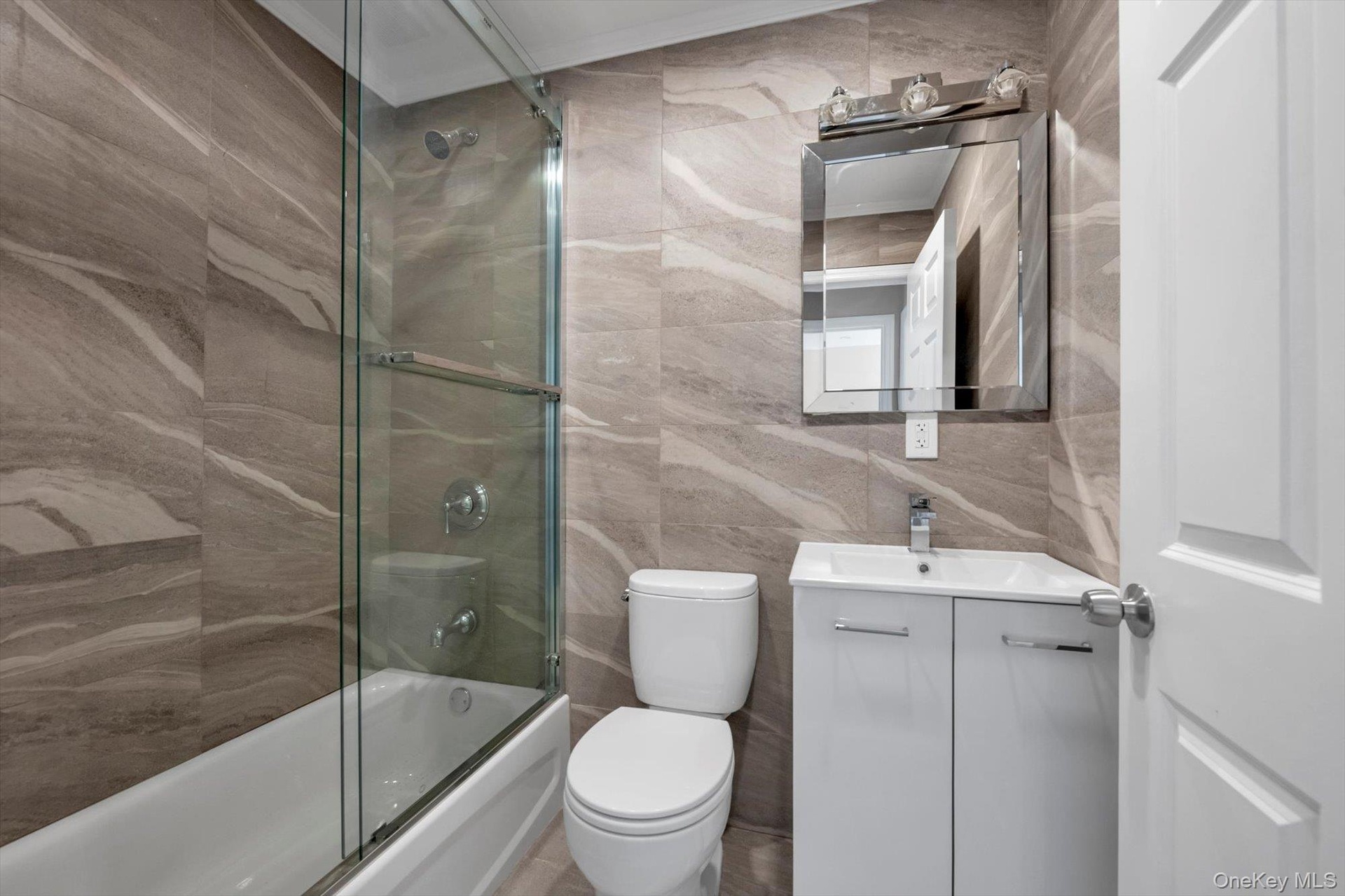 - Bathroom with tile walls, combined bath / shower with glass door, and vanity