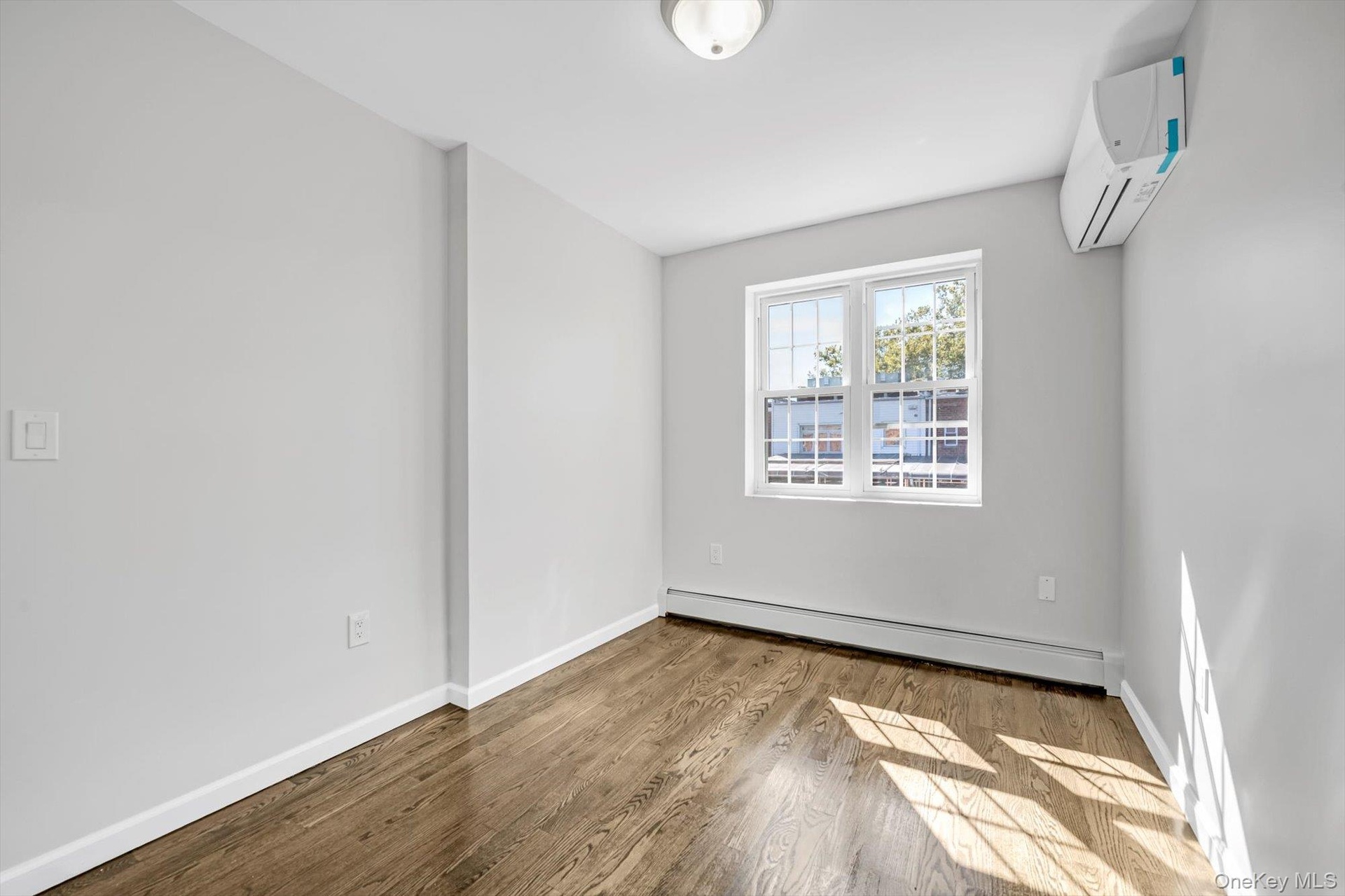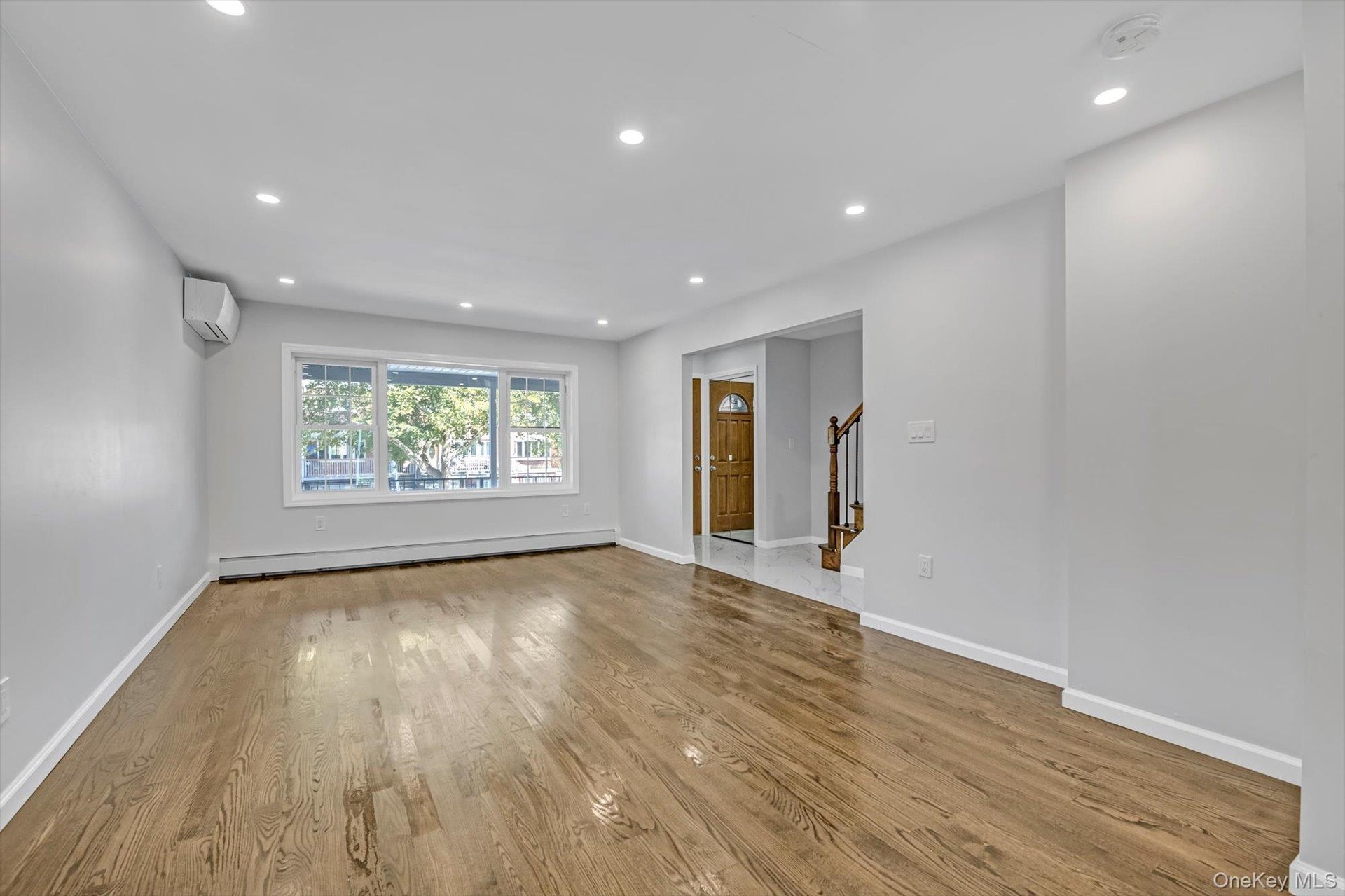 - Unfurnished living room with wood finished floors, recessed lighting, baseboard heating, and a wall mounted AC
