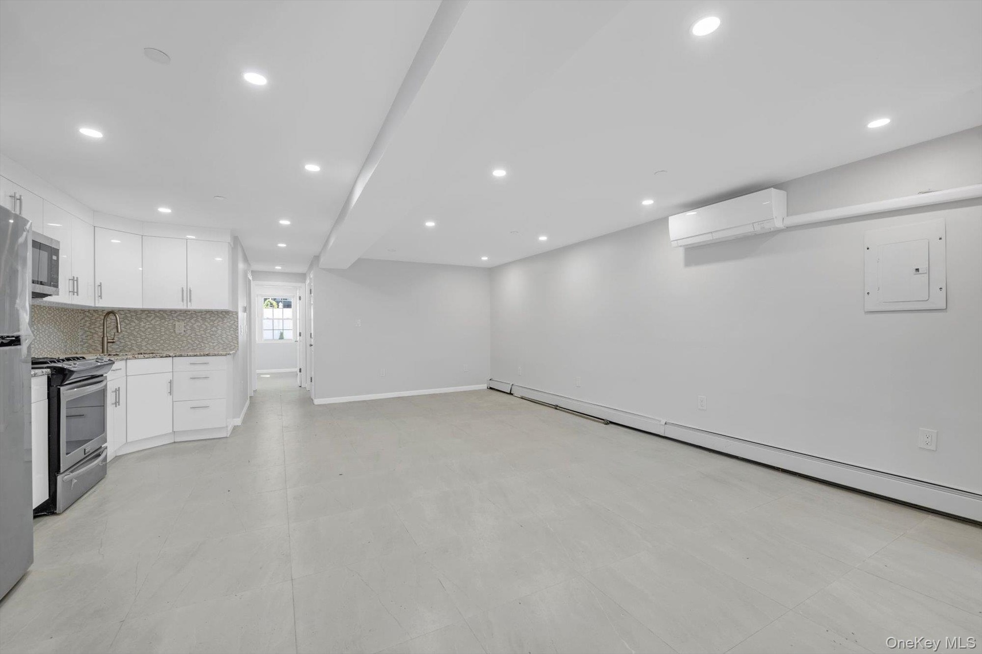 - Kitchen featuring white cabinetry, electric panel, recessed lighting, backsplash, and baseboard heating