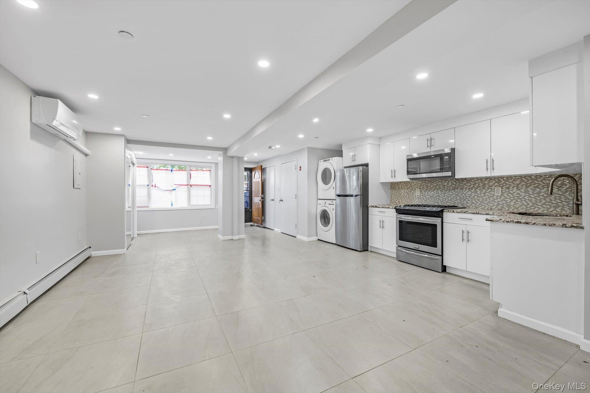 - Kitchen with baseboard heating, white cabinetry, stainless steel appliances, a wall mounted AC, and stacked washing machine and dryer