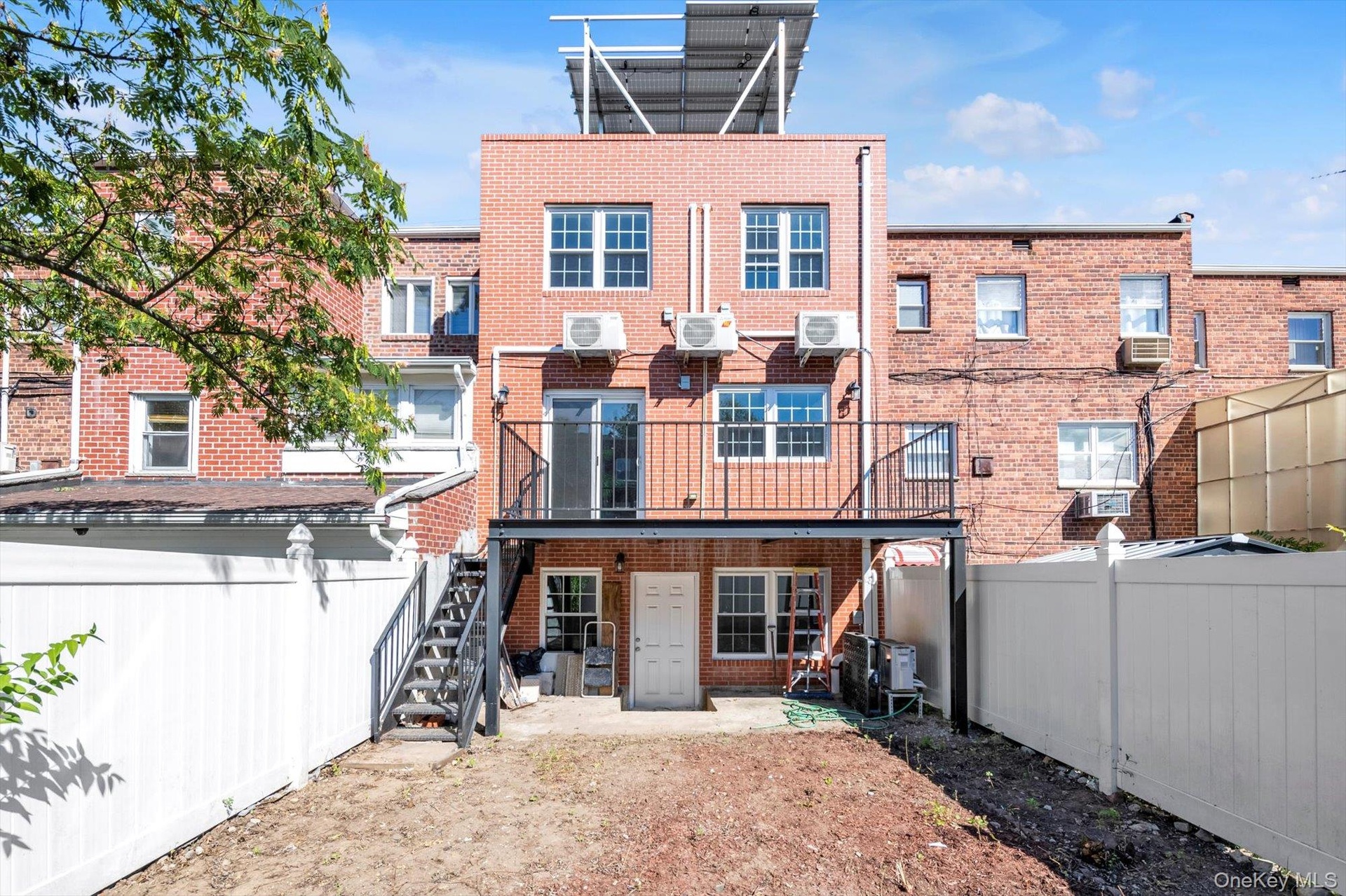 - Back of house featuring brick siding, a patio area, a balcony, a fenced backyard, and stairway