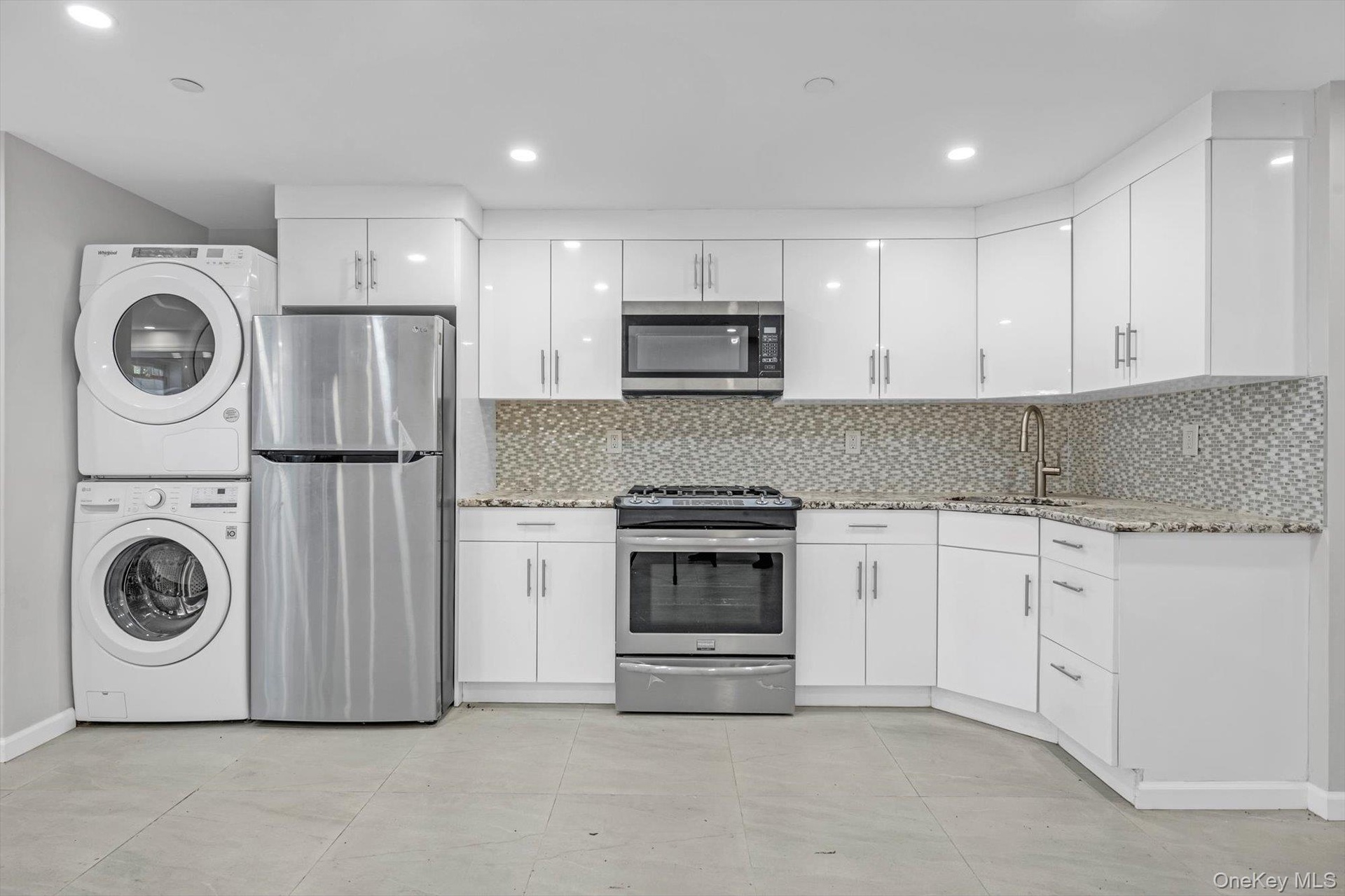 - Kitchen featuring white cabinets, estacked washer and dryer, appliances with stainless steel finishes, backsplash, and light stone counters