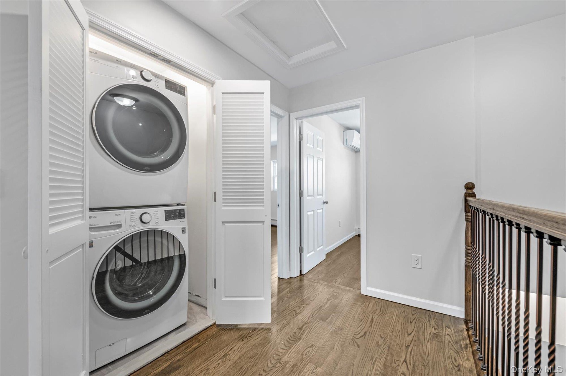 - Laundry area with stacked washer / drying machine, wood finished floors, attic access, and a wall mounted AC