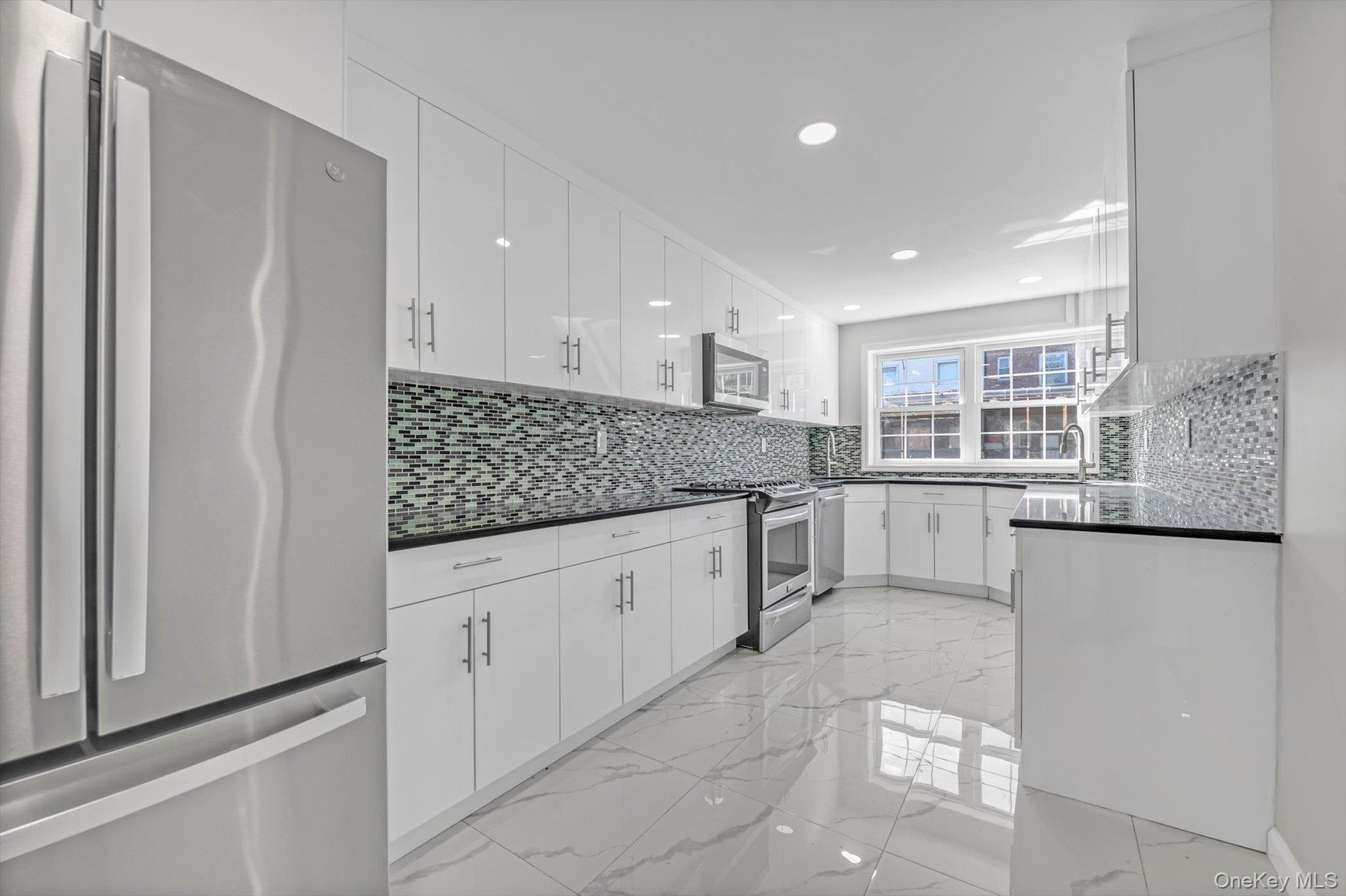- Kitchen featuring appliances with stainless steel finishes, tasteful backsplash, light marble finish floors, white cabinetry, and recessed lighting