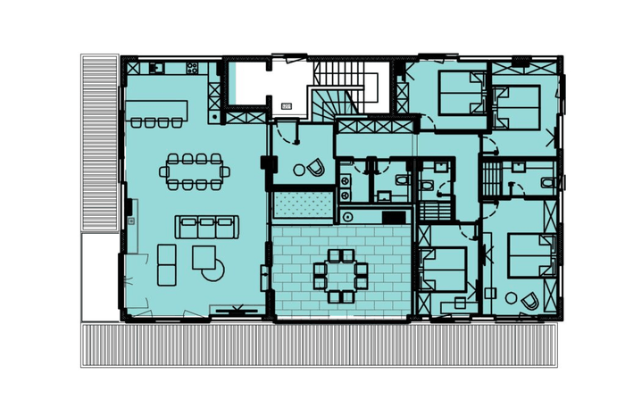 The penthouse also includes a rooftop terrace accessible via a private staircase, with a total gross area of 197.45 m2 (49.36 m2 net), perfect for relaxing, entertaining, and enjoying panoramic sea views.