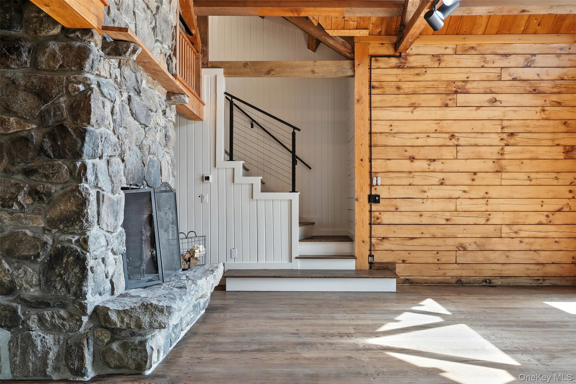 - Stairway with wood finished floors, a stone fireplace, beamed ceiling, and wooden walls