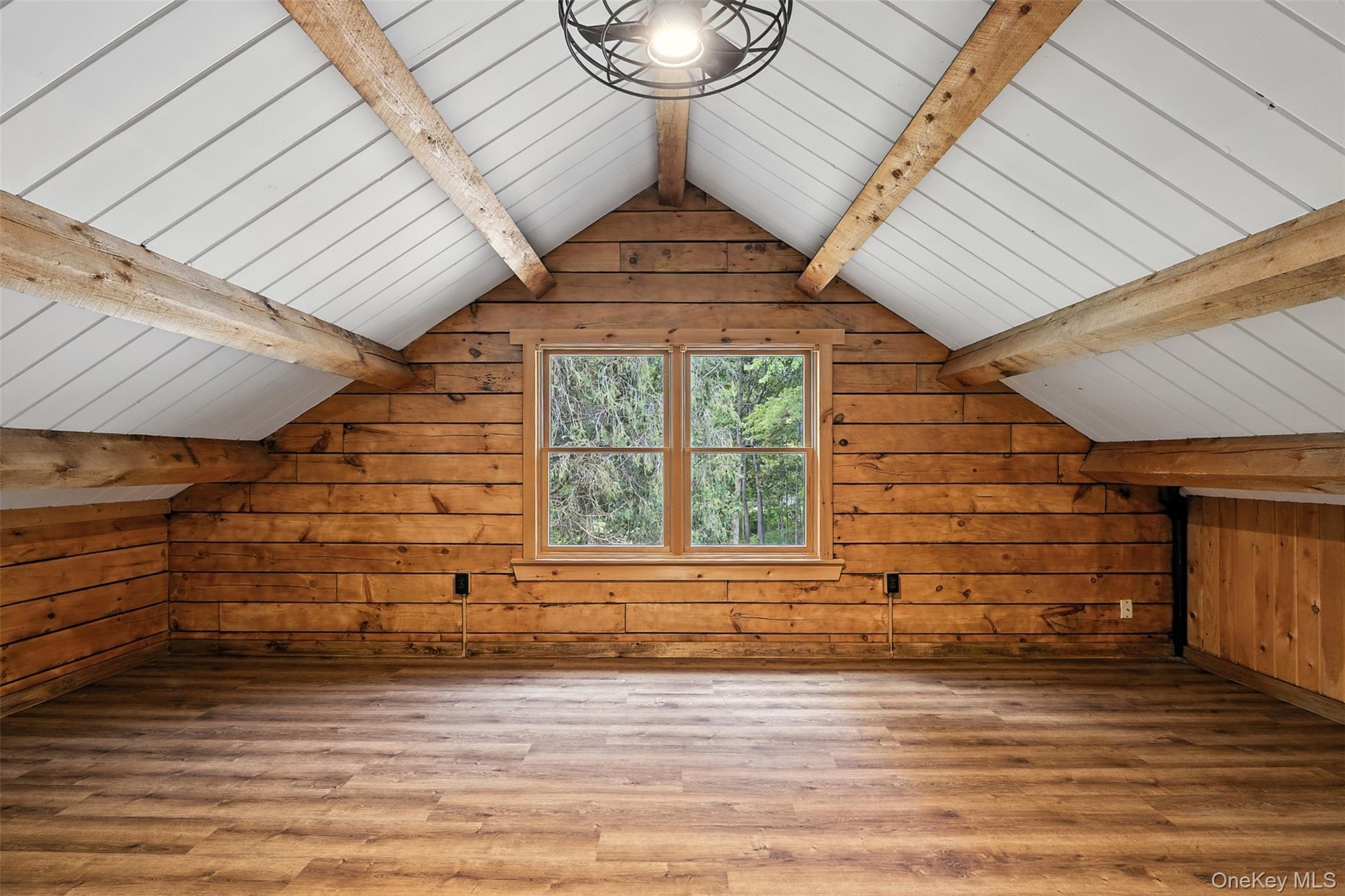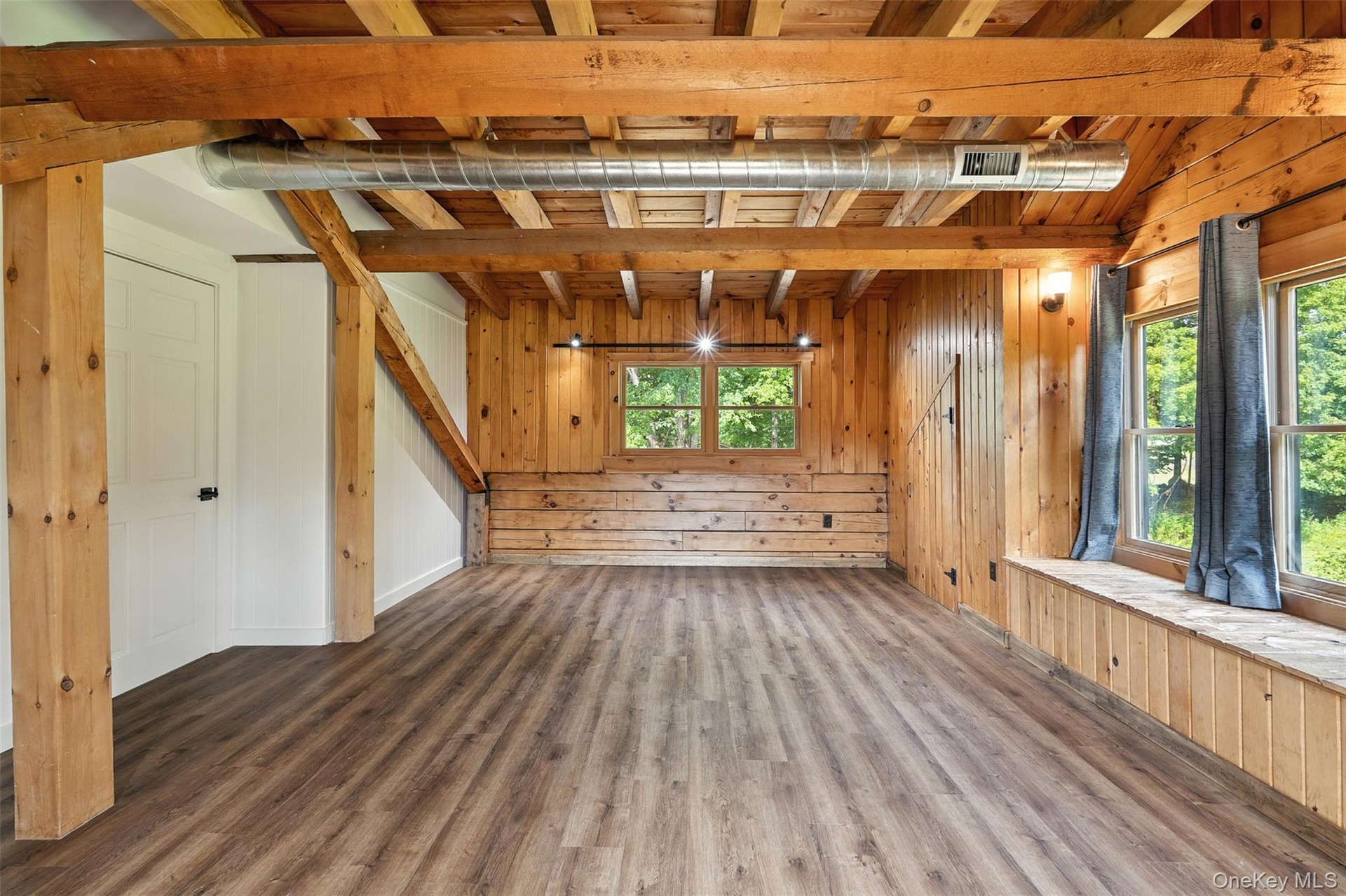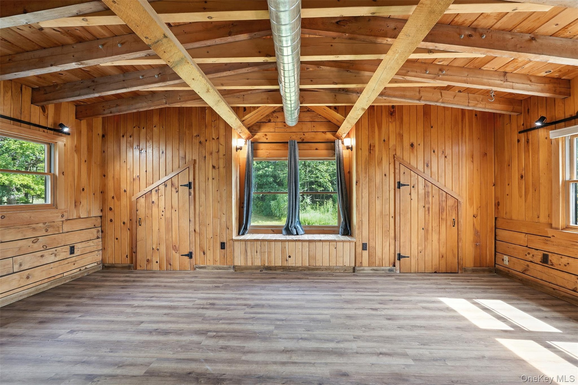 - Unfurnished living room featuring wooden walls, wood finished floors, and beamed ceiling