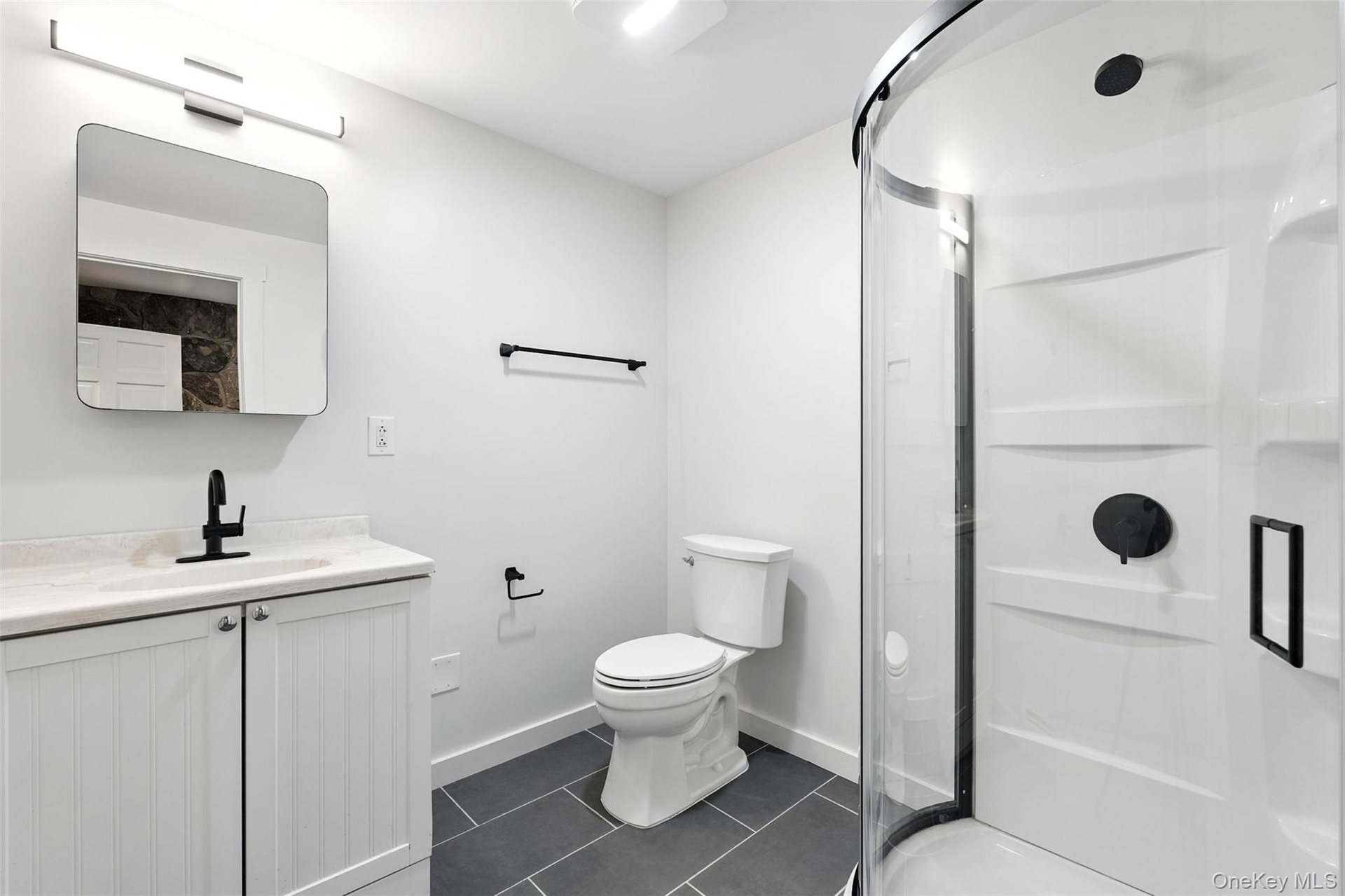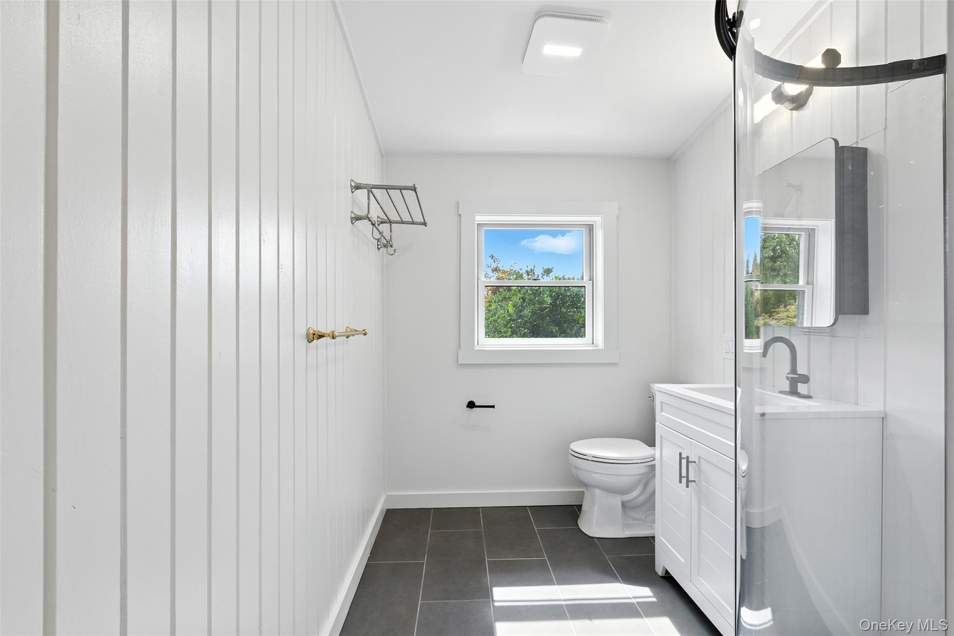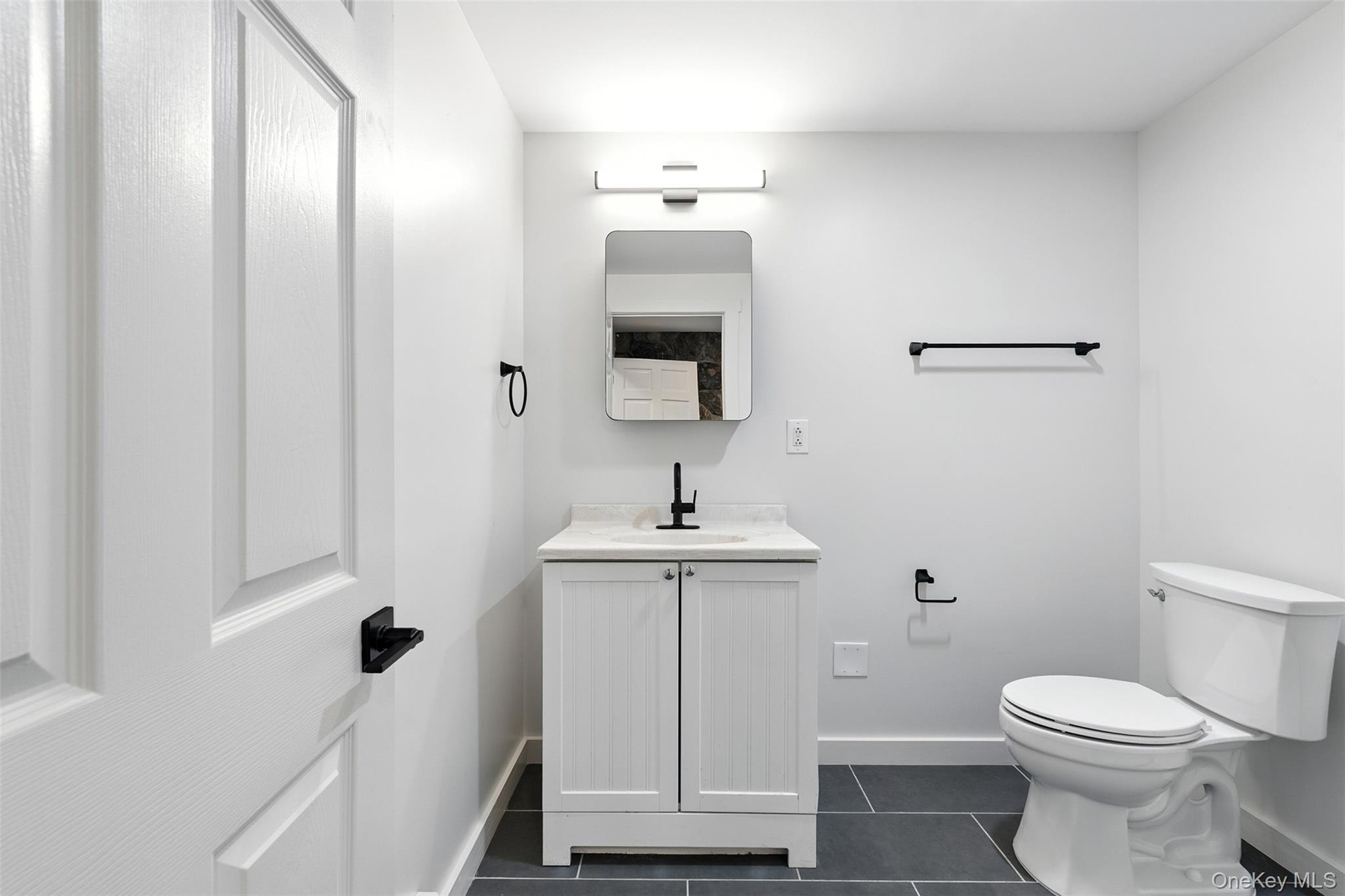 - Bathroom with vanity and dark tile patterned floors