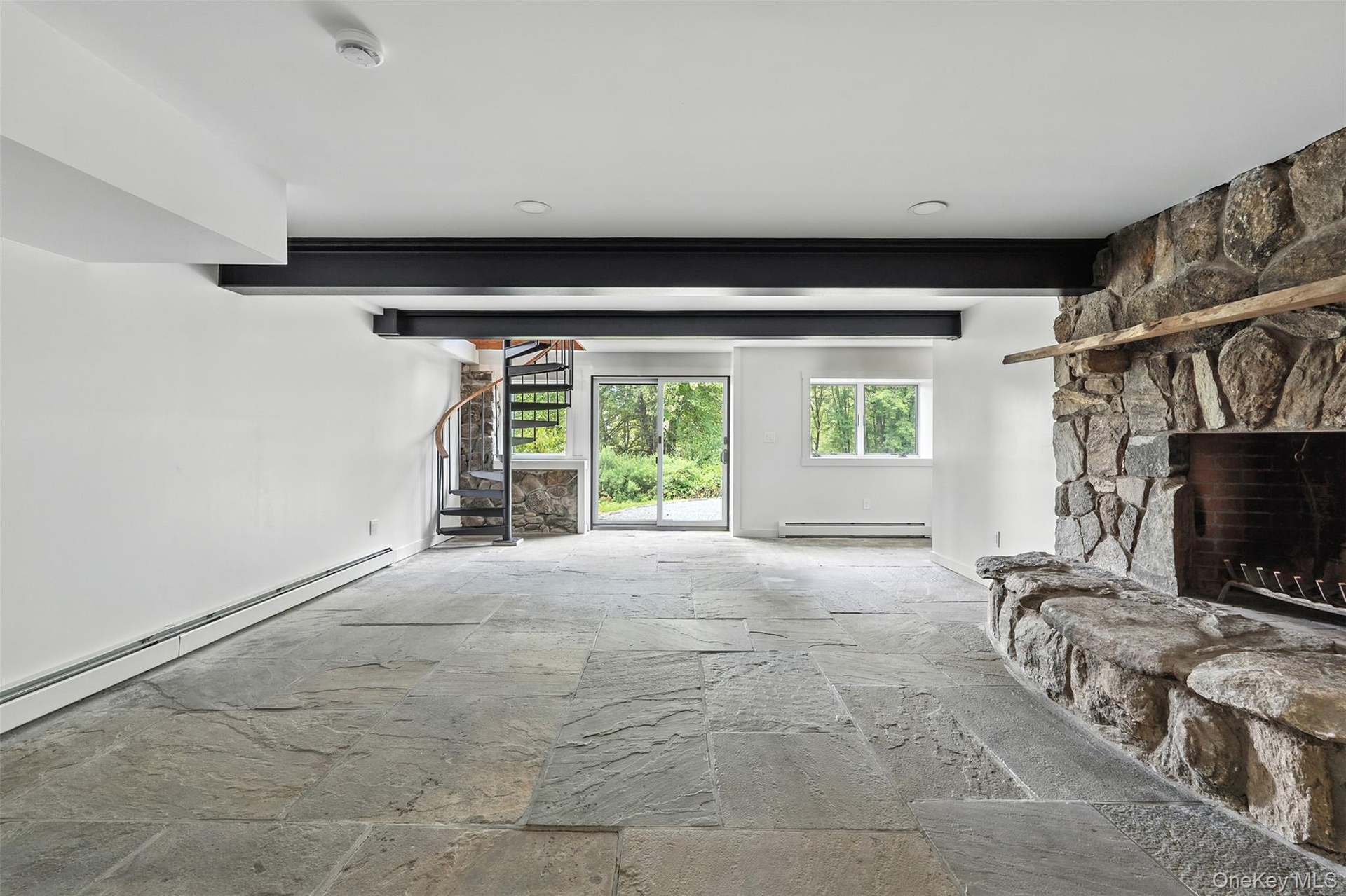 - Unfurnished living room with stone tile flooring, a stone fireplace, and beam ceiling
