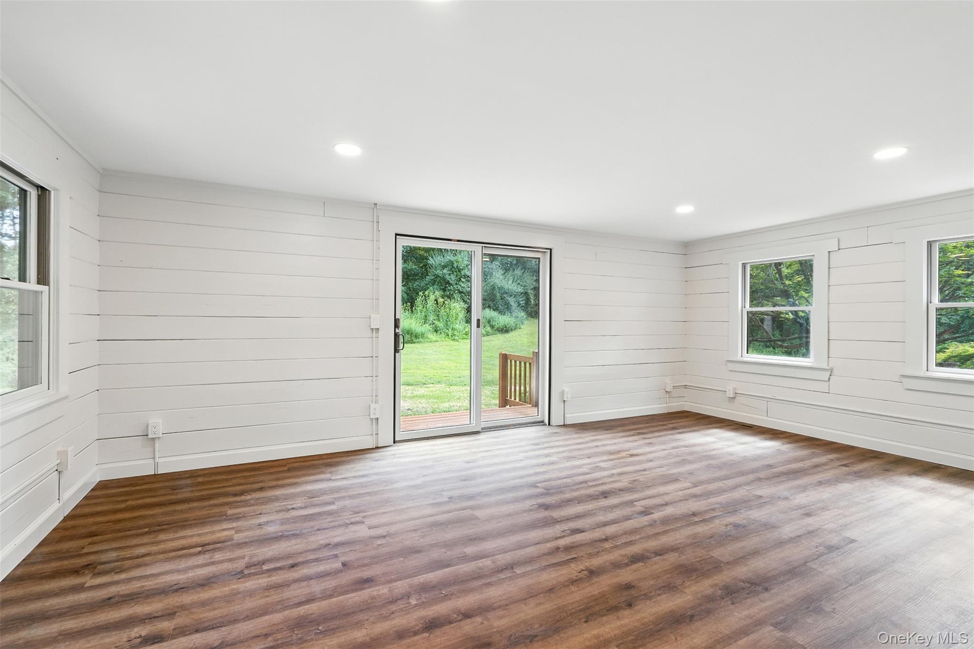 - Unfurnished room with wood finished floors, wood walls, and recessed lighting