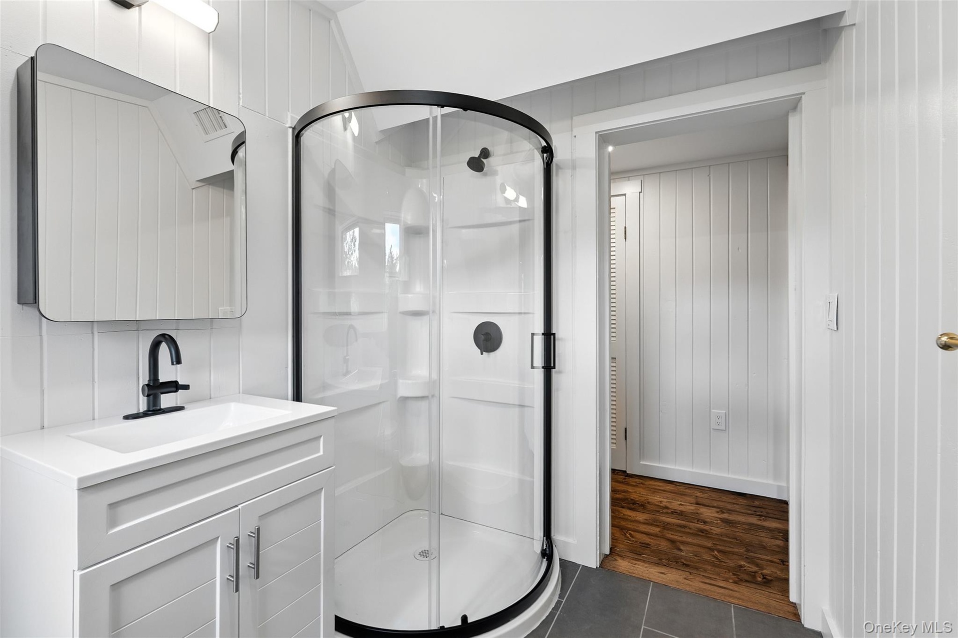 - Full bath with dark tile patterned flooring, vanity, a shower stall, and wood walls