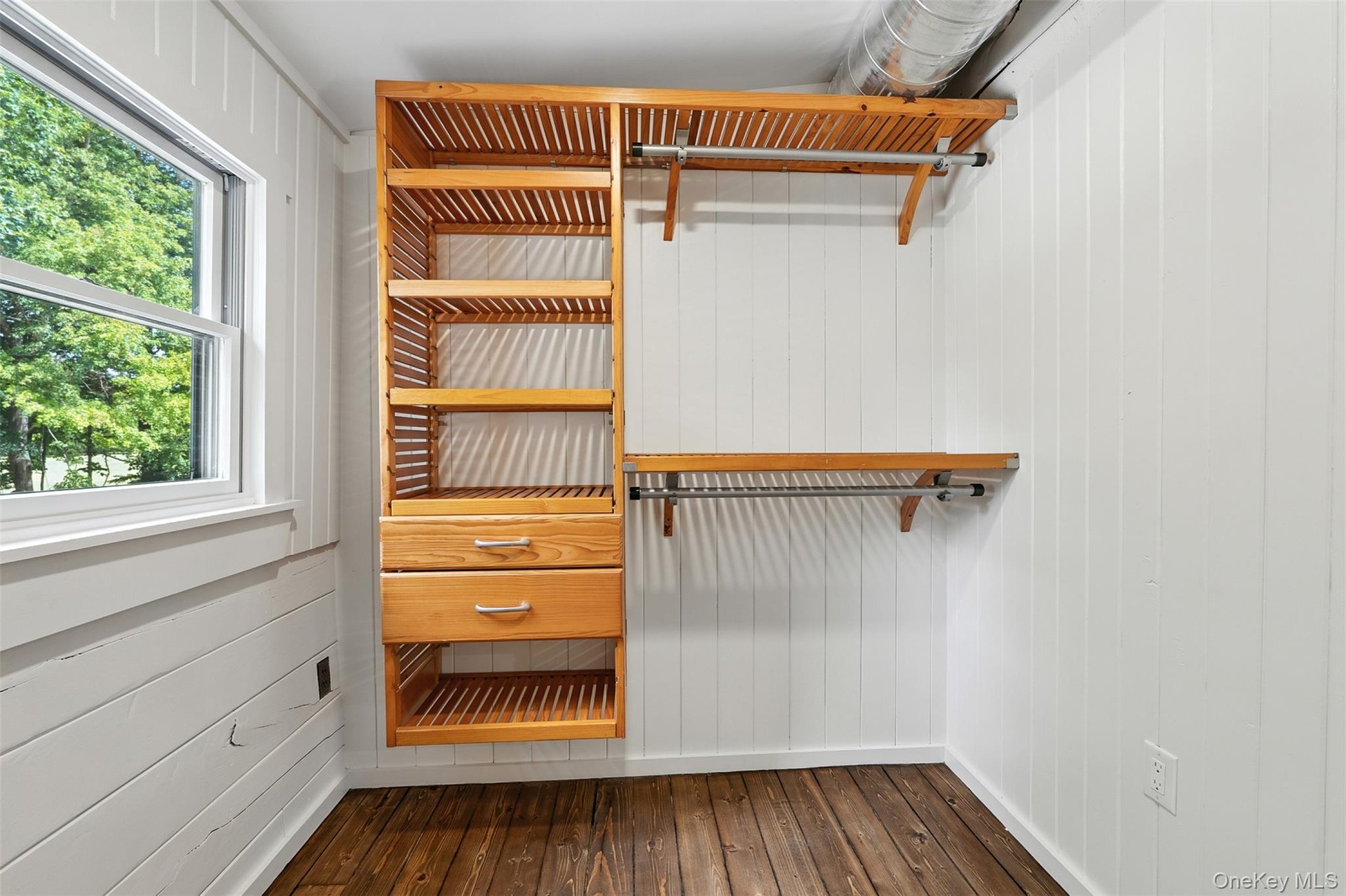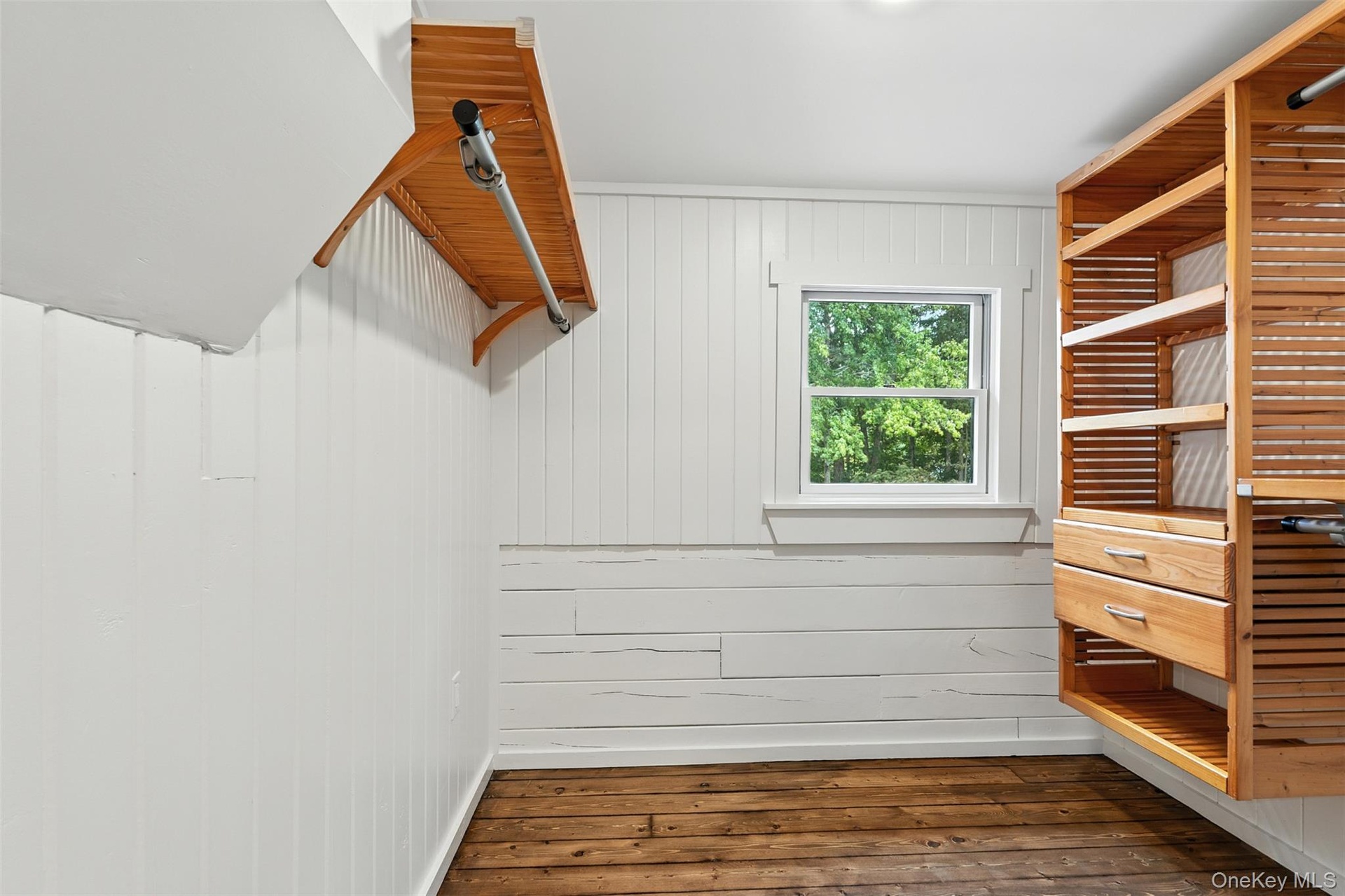 - Walk in closet with dark wood-style flooring