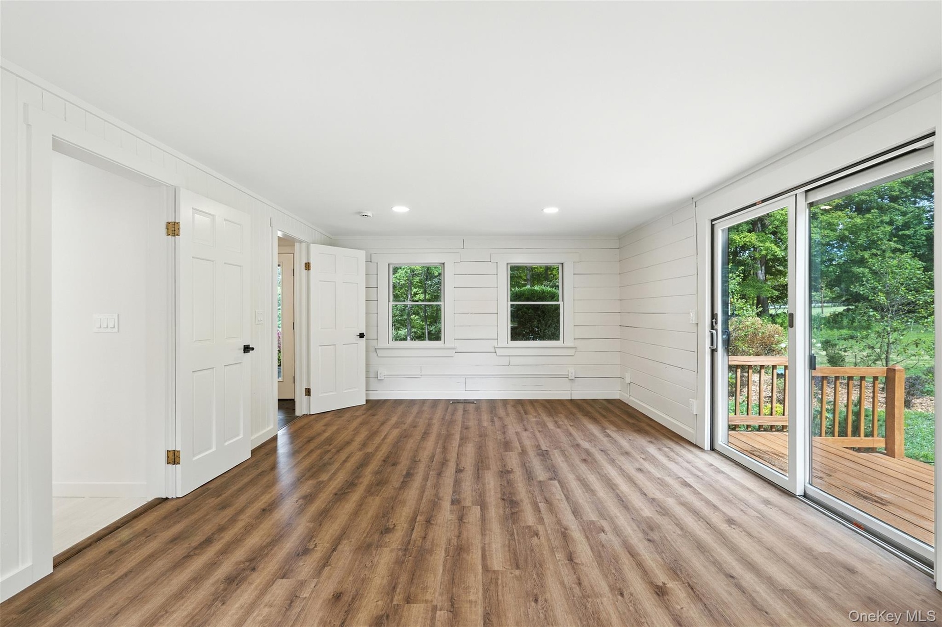 - Unfurnished bedroom featuring wood finished floors, wooden walls, access to exterior, and recessed lighting