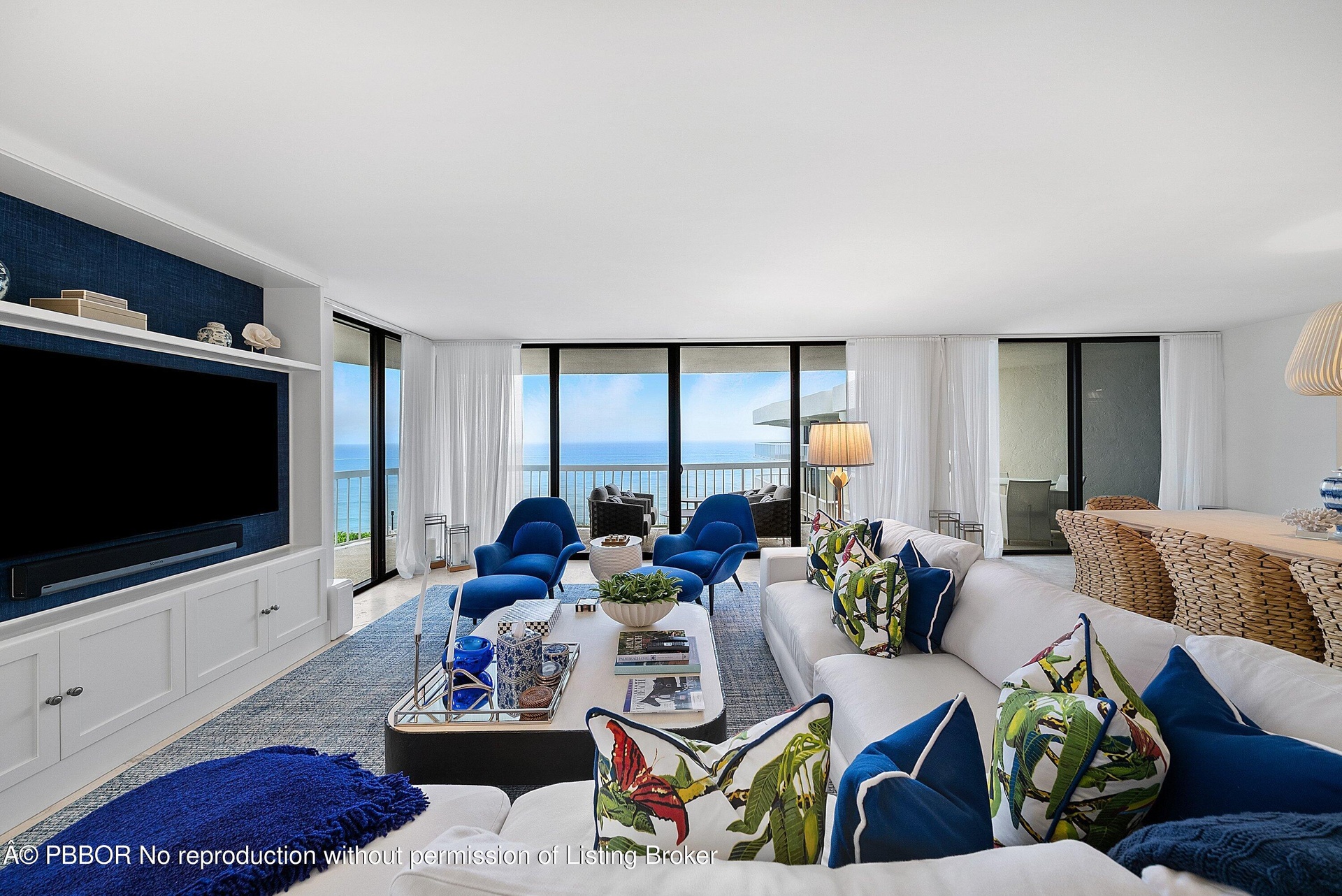 Ocean Front Penthouse with the water views everyone wants! This 3 bedroom, 2.5 bath residence is spacious and gracious & renovated, with 2 balconies that provide east and west exposures offering an abundance of light to showcase the beautiful, colorful interiors furnished by an international interior designer and is offered fully furnished/''turnkey''. The outdoor seating on the balconies offers additional living areas to enjoy the ocean views, breezes and westerly sunsets. The Meridian has completed the Milestone requirements, has a newly renovated pool area and spa on the ocean with a stairway to the beach. Entry gate is manned 24 hours, full time manager, tennis courts, garage parking. Meridian offers the best of luxury living!