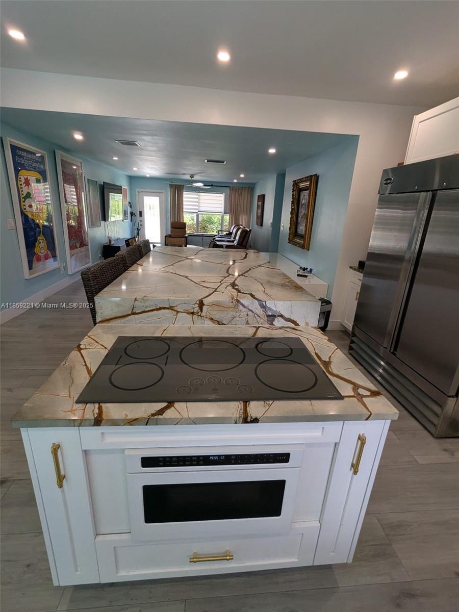Luxurious kitchen with high ceiling, accented by designer recessed lighting and appliances matching the cabinetry that complement the space beautifull