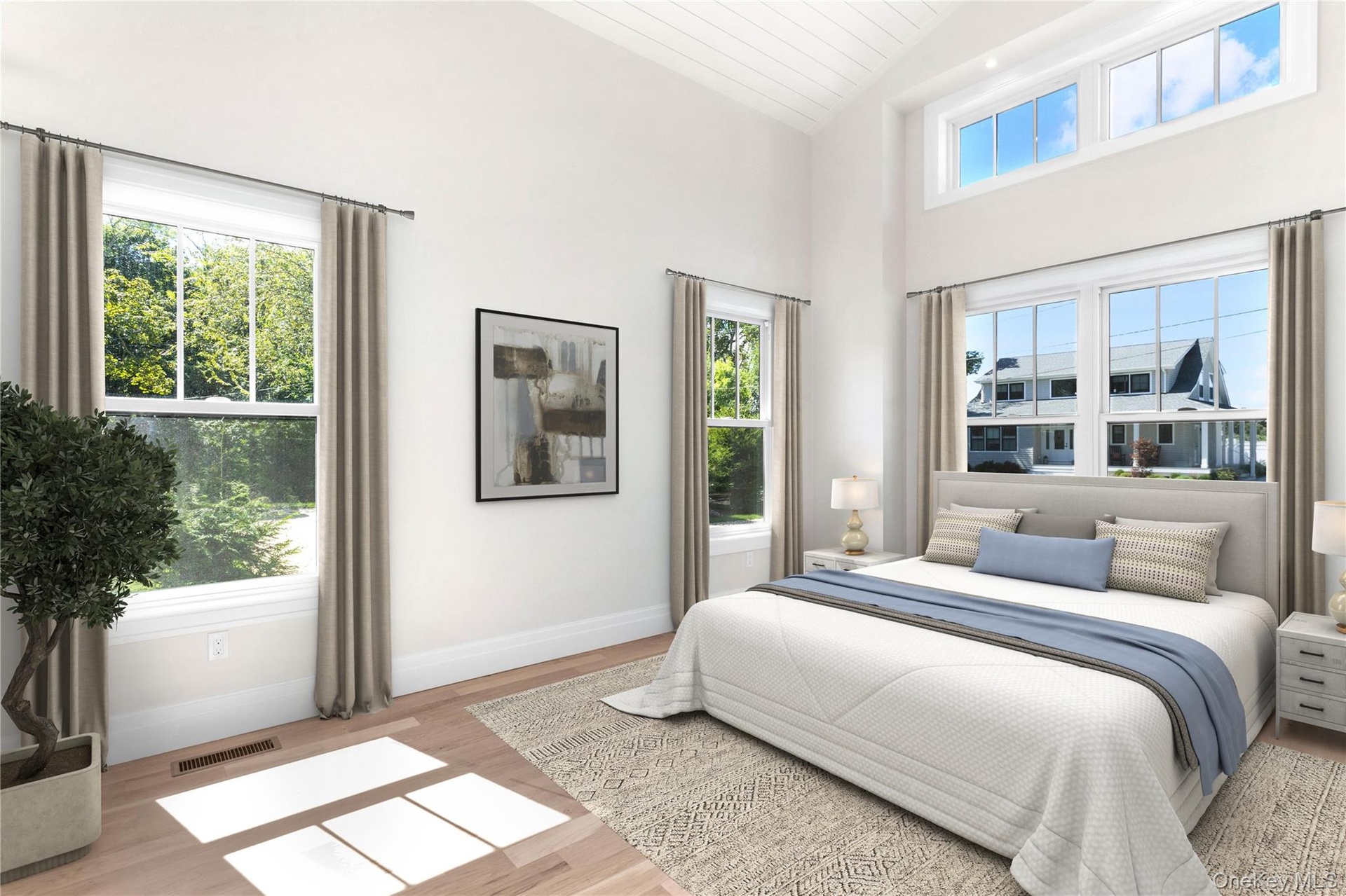 - staged Bedroom featuring light wood-type flooring, multiple windows, and high vaulted ceiling