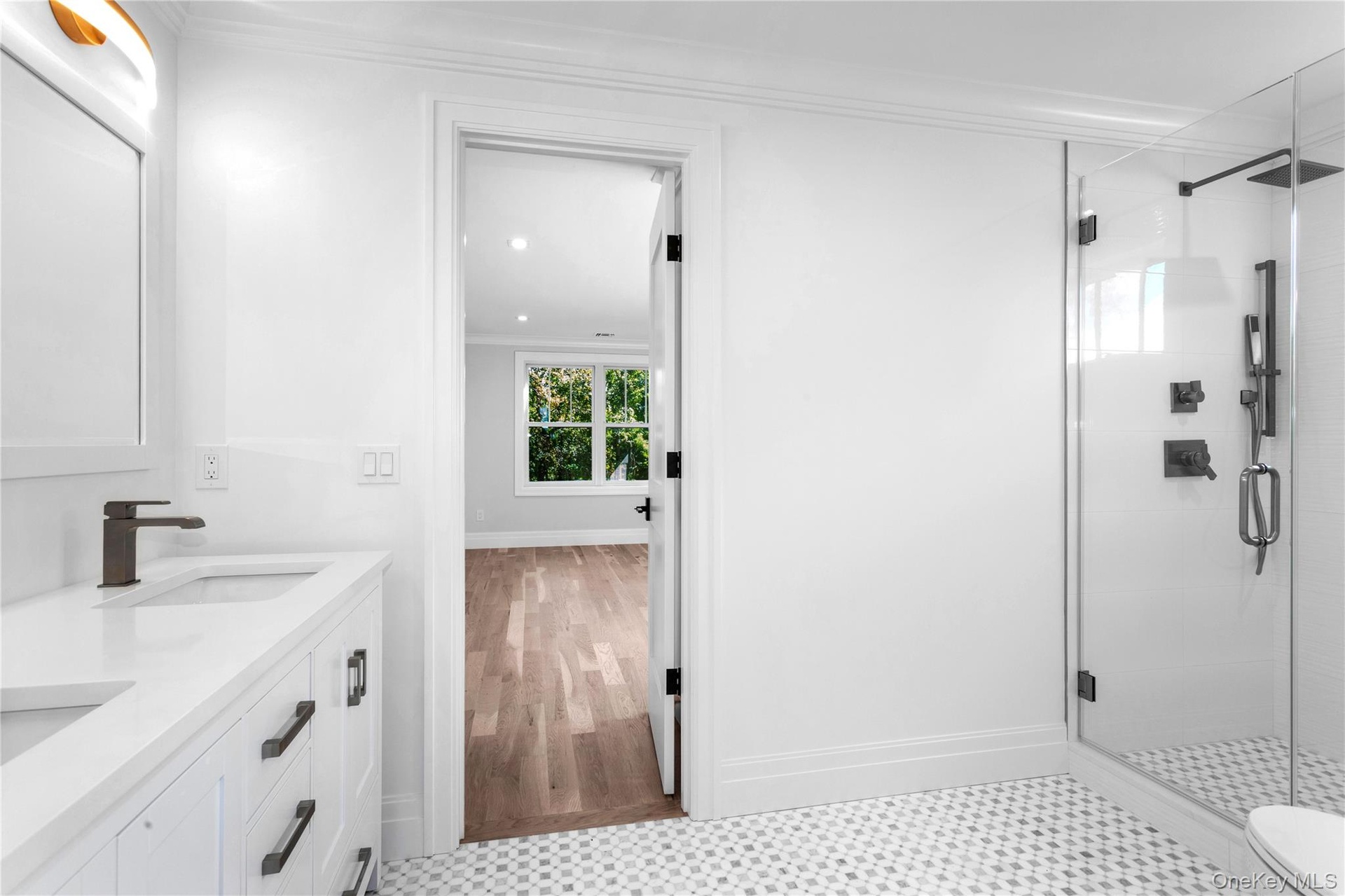 - Full bathroom featuring crown molding, a shower stall, double vanity, and recessed lighting