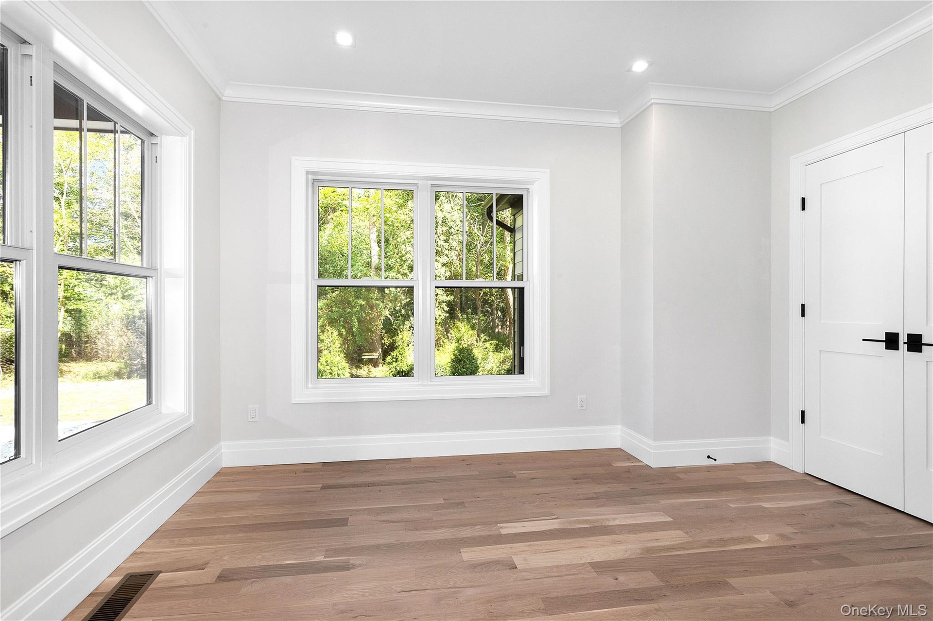 - Empty room with wood finished floors, crown molding, and recessed lighting
