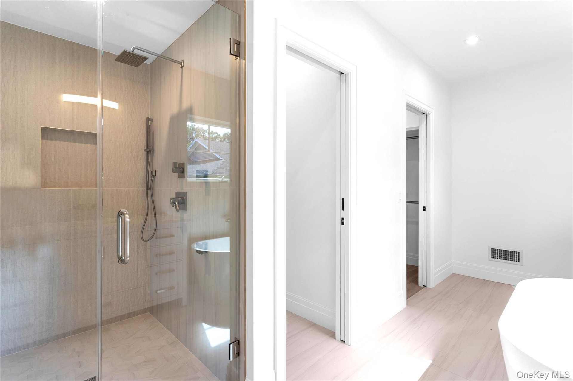 - Bathroom featuring a shower stall and a walk-in wardrobe closet