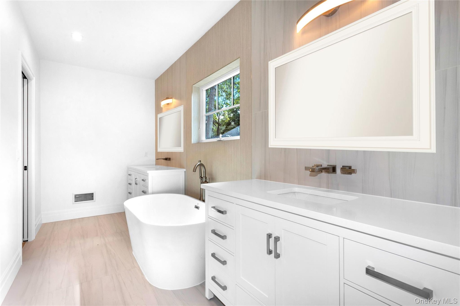 - staged mirrors Full bath featuring vanity and a freestanding bath
