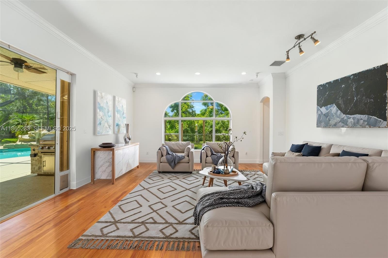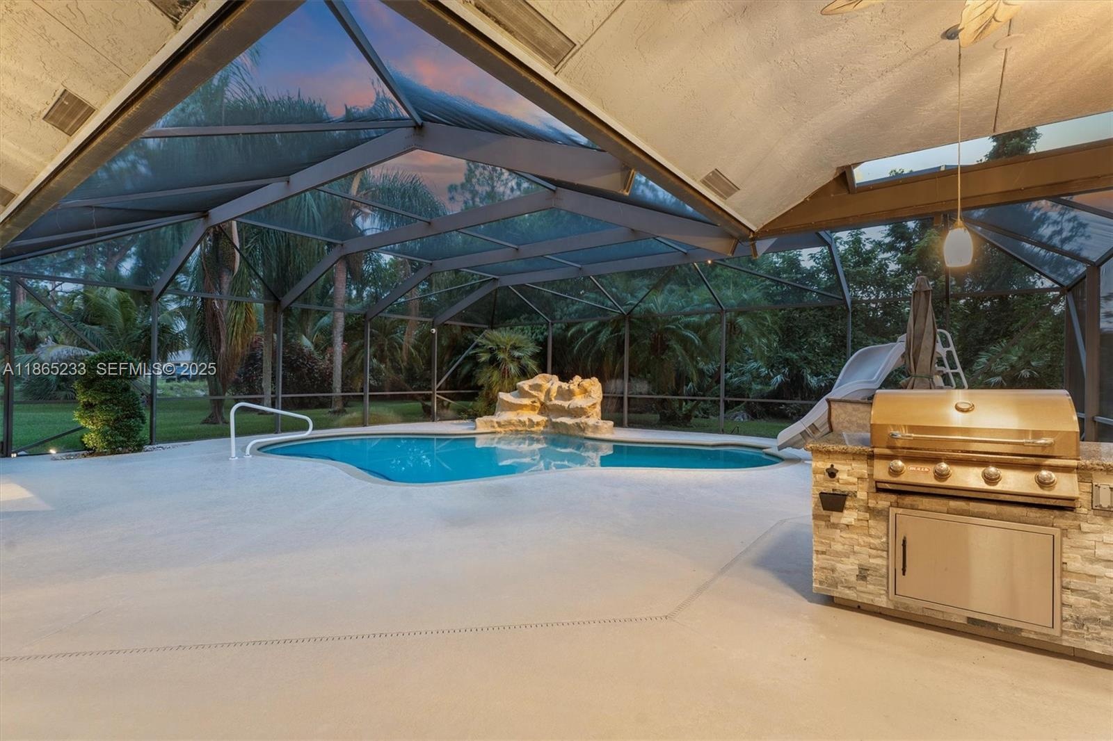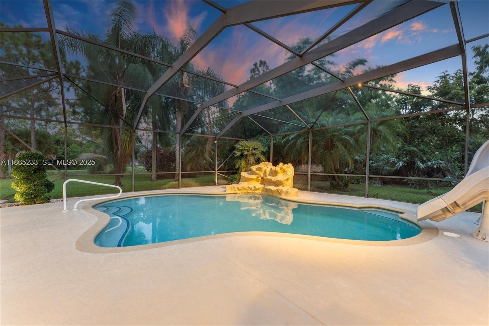 Your private sanctuary where luxury, space & natural beauty unite. This sprawling, split floor plan 3/3 plus Office sits on a serene 1.4-acres. From the moment you enter the massive foyer, soaring 14–16 ft. ceilings, expansive windows & two-sided coral rock fireplace create a sense of grandeur. The home’s thoughtful design includes wet bar in the grand foyer, custom stained-glass accents, recessed lighting, dual zoned A/C, well & City water, & beautifully updated baths w/ granite & rich cabinetry. The gourmet kitchen offers beautiful granite countertops, soft-close cabinetry & brand-new cooktop—perfect for both everyday living & entertaining. Outdoors, the retreat continues with resort-style pool & spa with waterfall & slide, beautiful landscaping, fruit trees & fish in the joining stream.