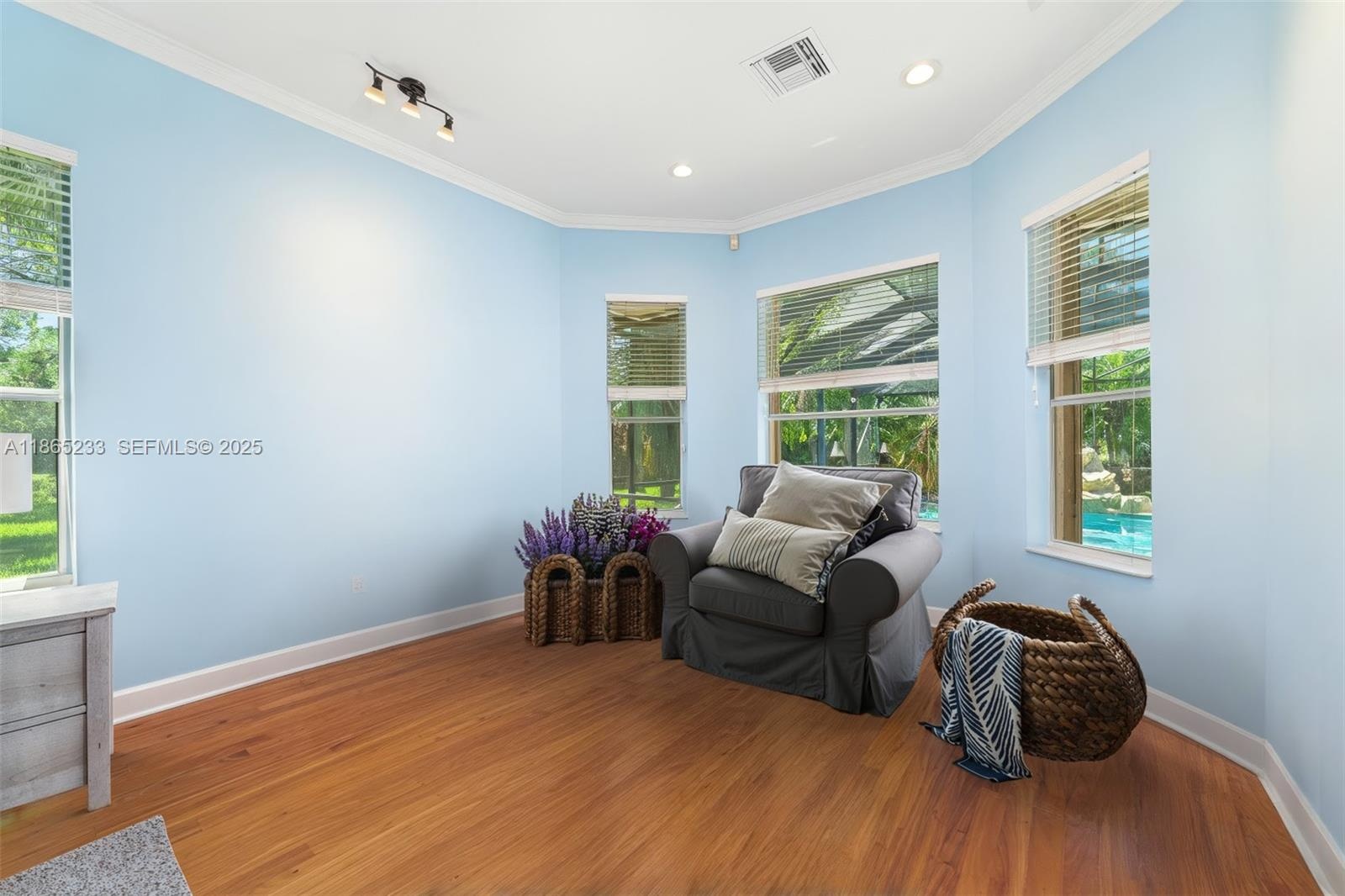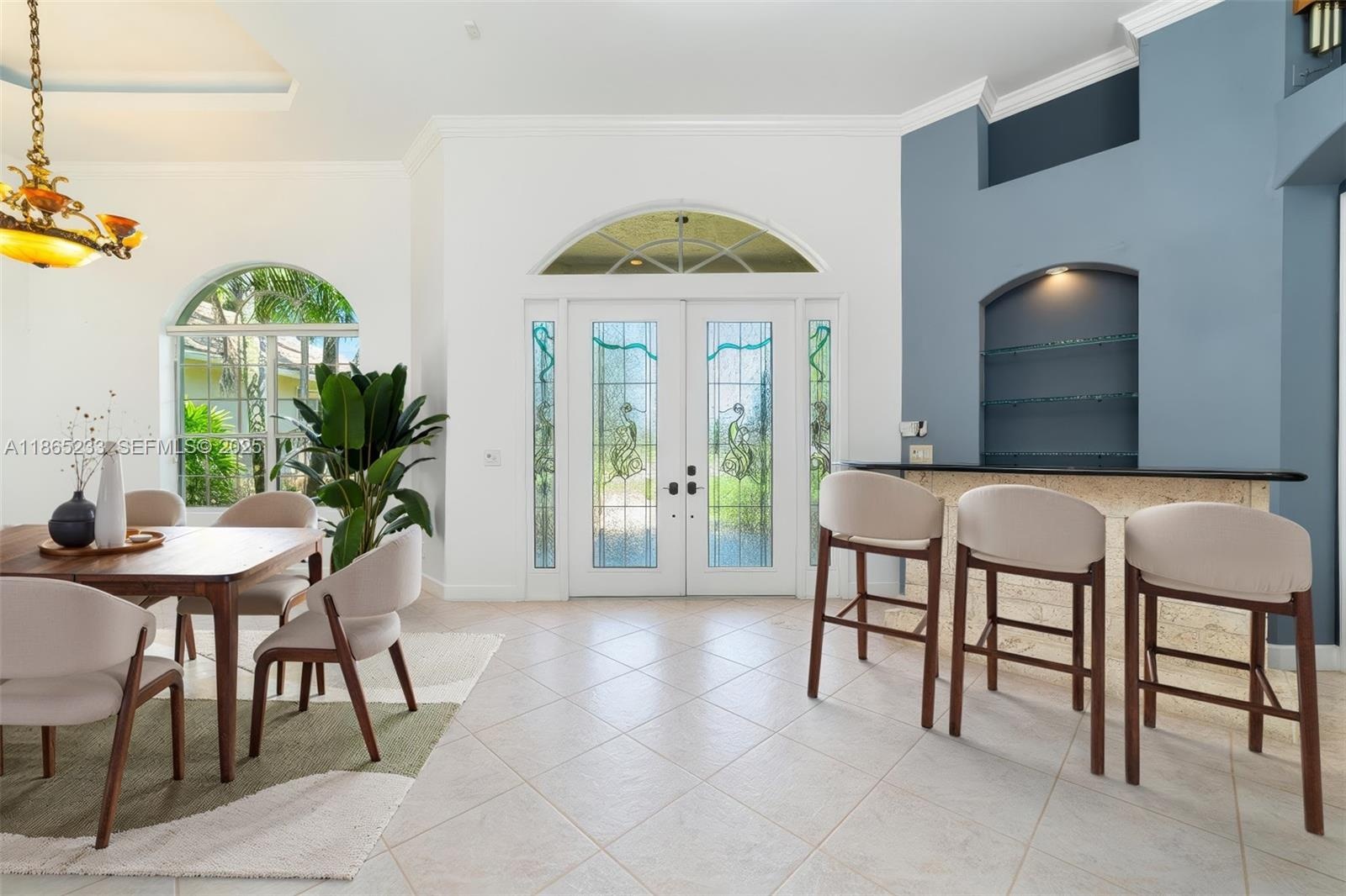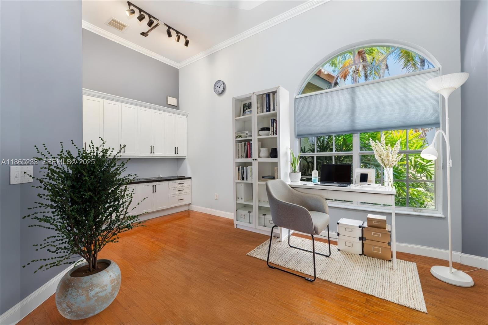 Your private sanctuary where luxury, space & natural beauty unite. This sprawling, split floor plan 3/3 plus Office sits on a serene 1.4-acres. From the moment you enter the massive foyer, soaring 14–16 ft. ceilings, expansive windows & two-sided coral rock fireplace create a sense of grandeur. The home’s thoughtful design includes wet bar in the grand foyer, custom stained-glass accents, recessed lighting, dual zoned A/C, well & City water, & beautifully updated baths w/ granite & rich cabinetry. The gourmet kitchen offers beautiful granite countertops, soft-close cabinetry & brand-new cooktop—perfect for both everyday living & entertaining. Outdoors, the retreat continues with resort-style pool & spa with waterfall & slide, beautiful landscaping, fruit trees & fish in the joining stream.