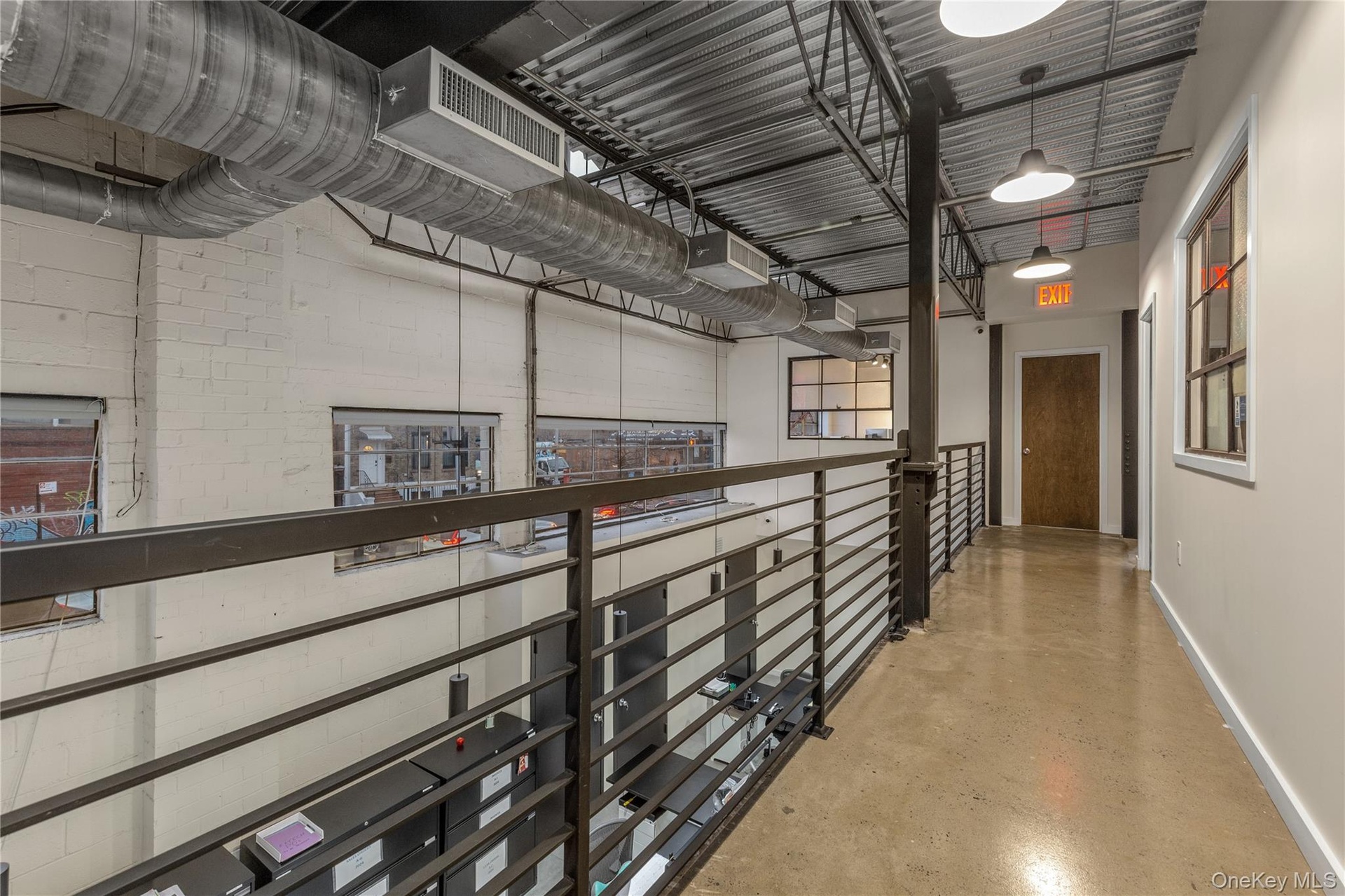 - Misc room featuring unfinished concrete floors, metal wall, and a workshop area