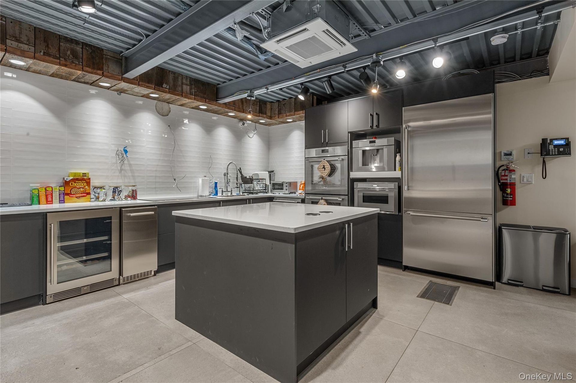 - Kitchen with appliances with stainless steel finishes, beverage cooler, a center island, dark cabinets, and modern cabinets