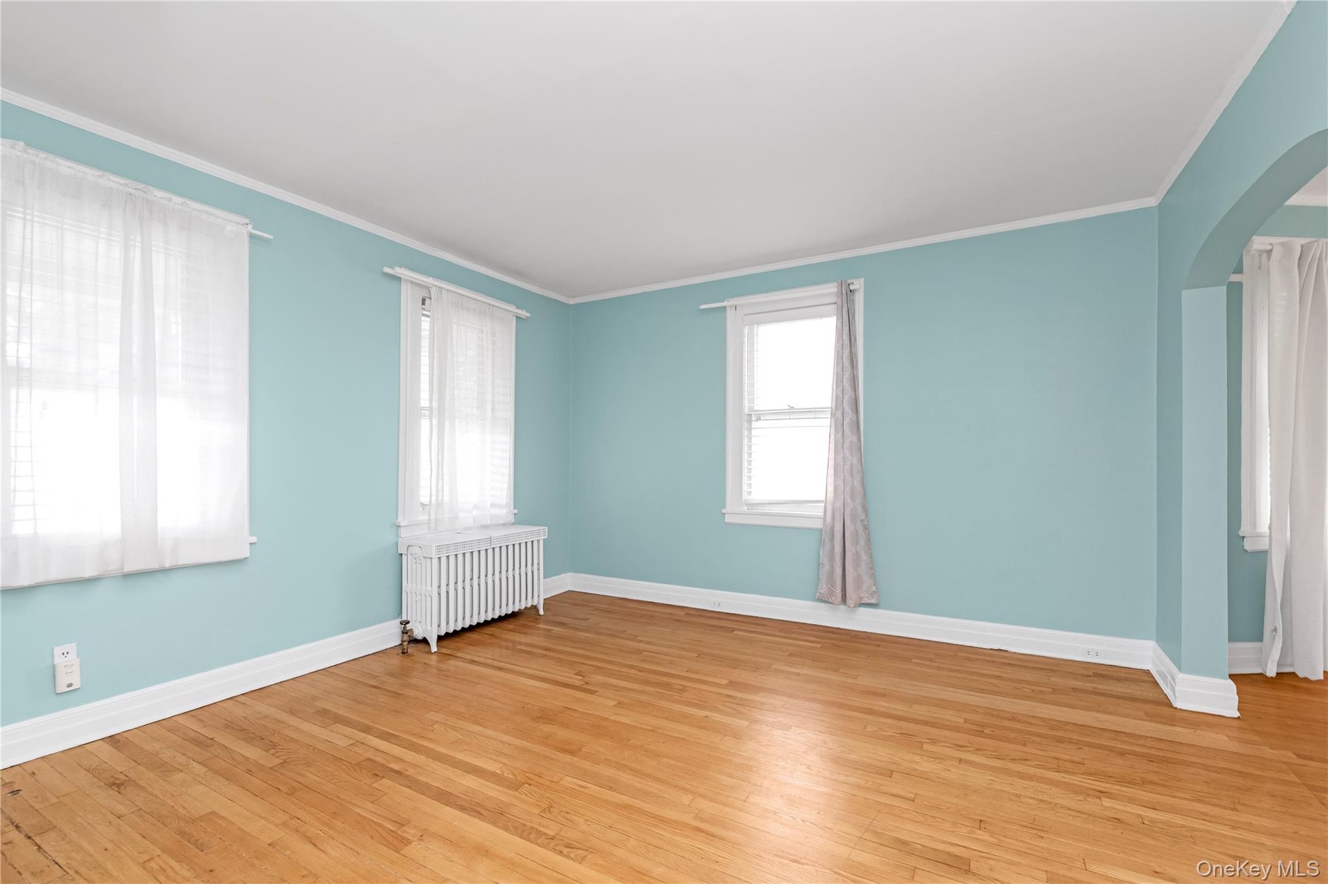 - Unfurnished room featuring radiator heating unit, light wood-type flooring, arched walkways, and ornamental molding