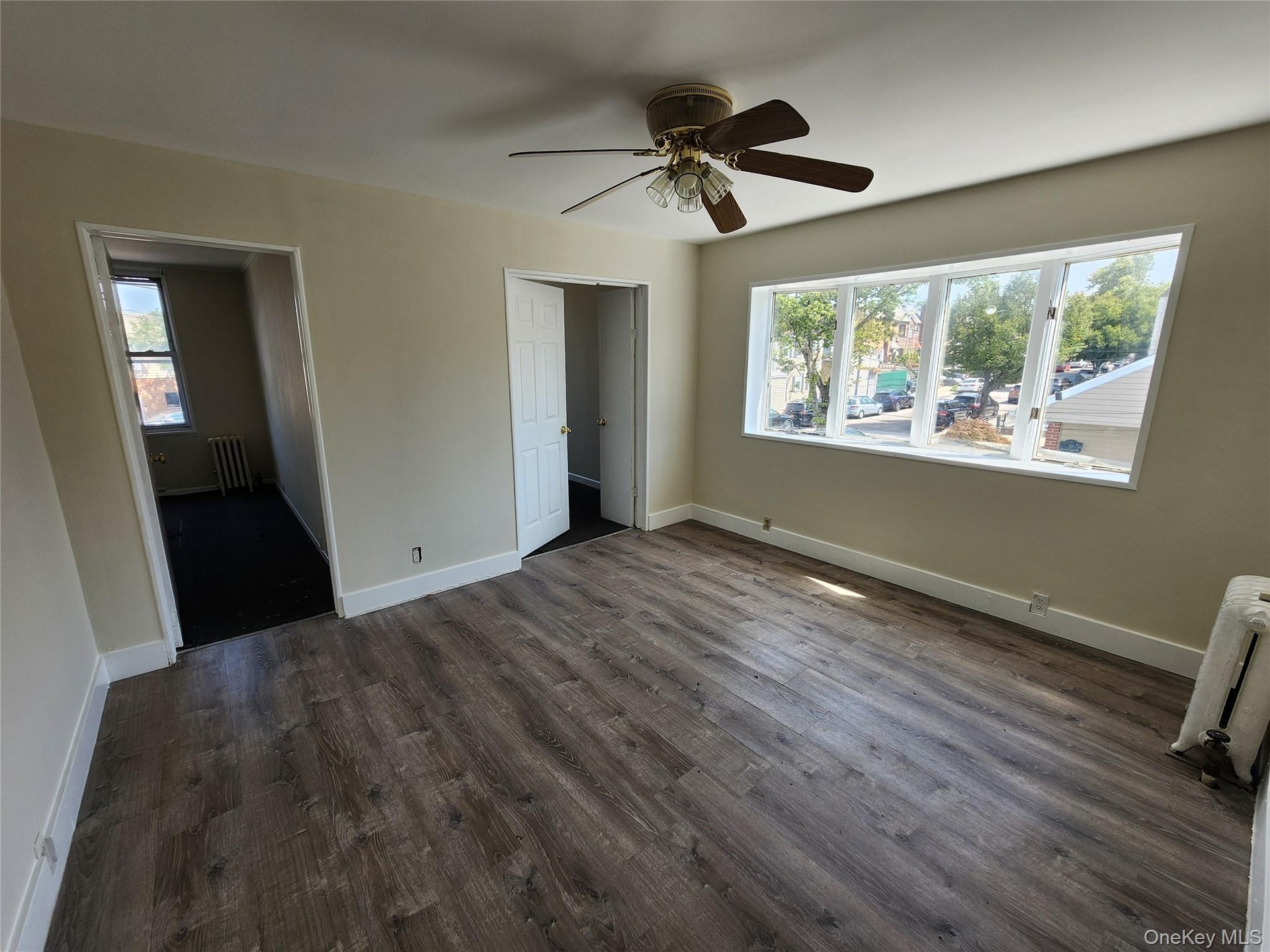 - Unfurnished bedroom with a ceiling fan, dark wood-type flooring, and radiator