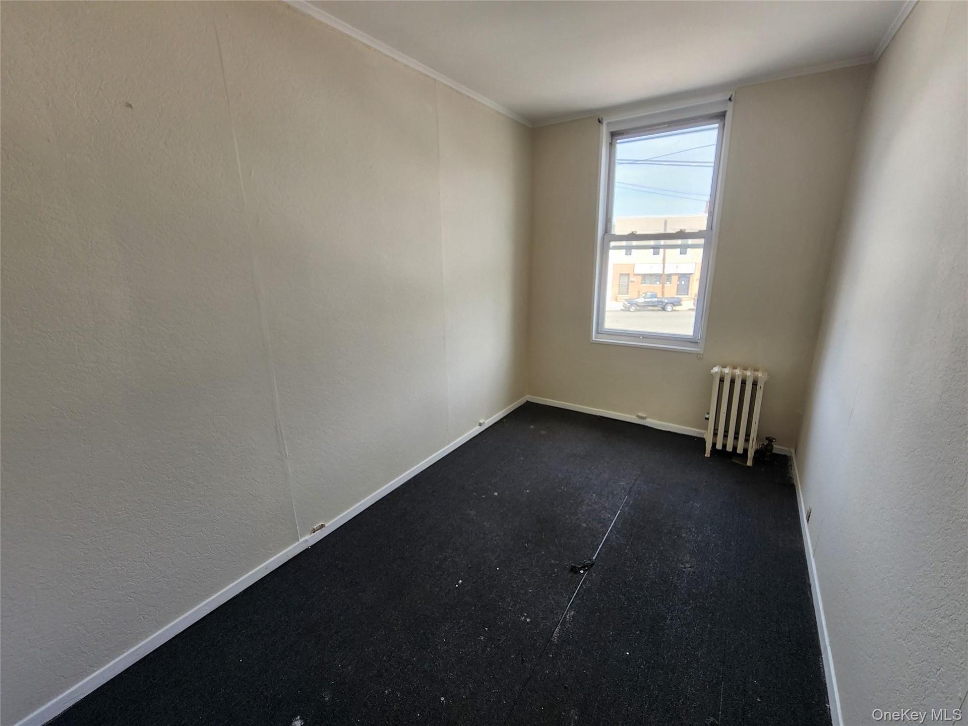 - Spare room featuring radiator, dark colored carpet, and ornamental molding