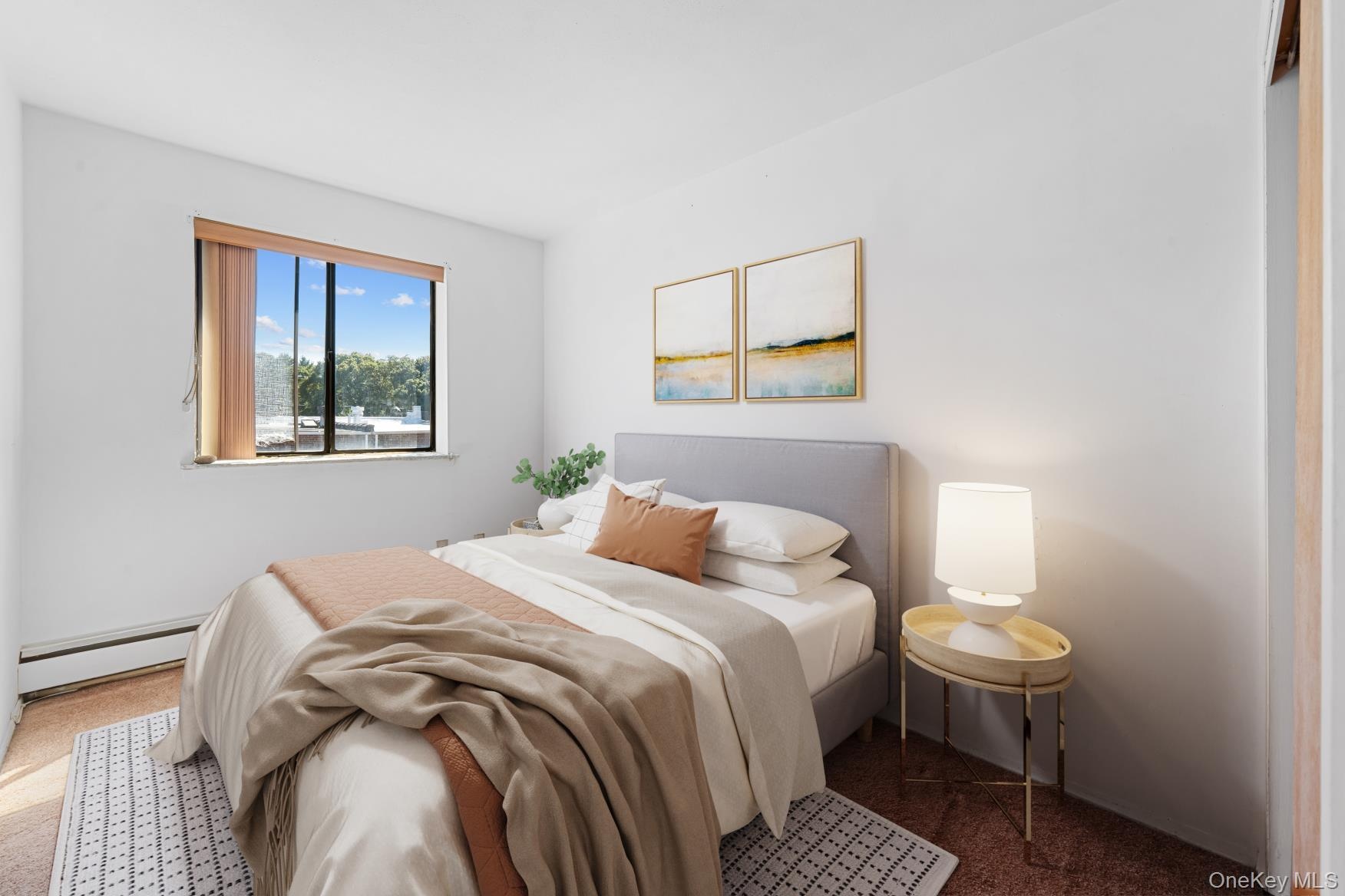 - Carpeted bedroom with a baseboard radiator