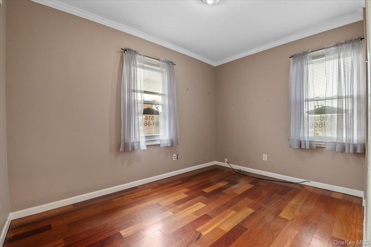 - Unfurnished bedroom with multiple windows, dark wood finished floors, and ornamental molding