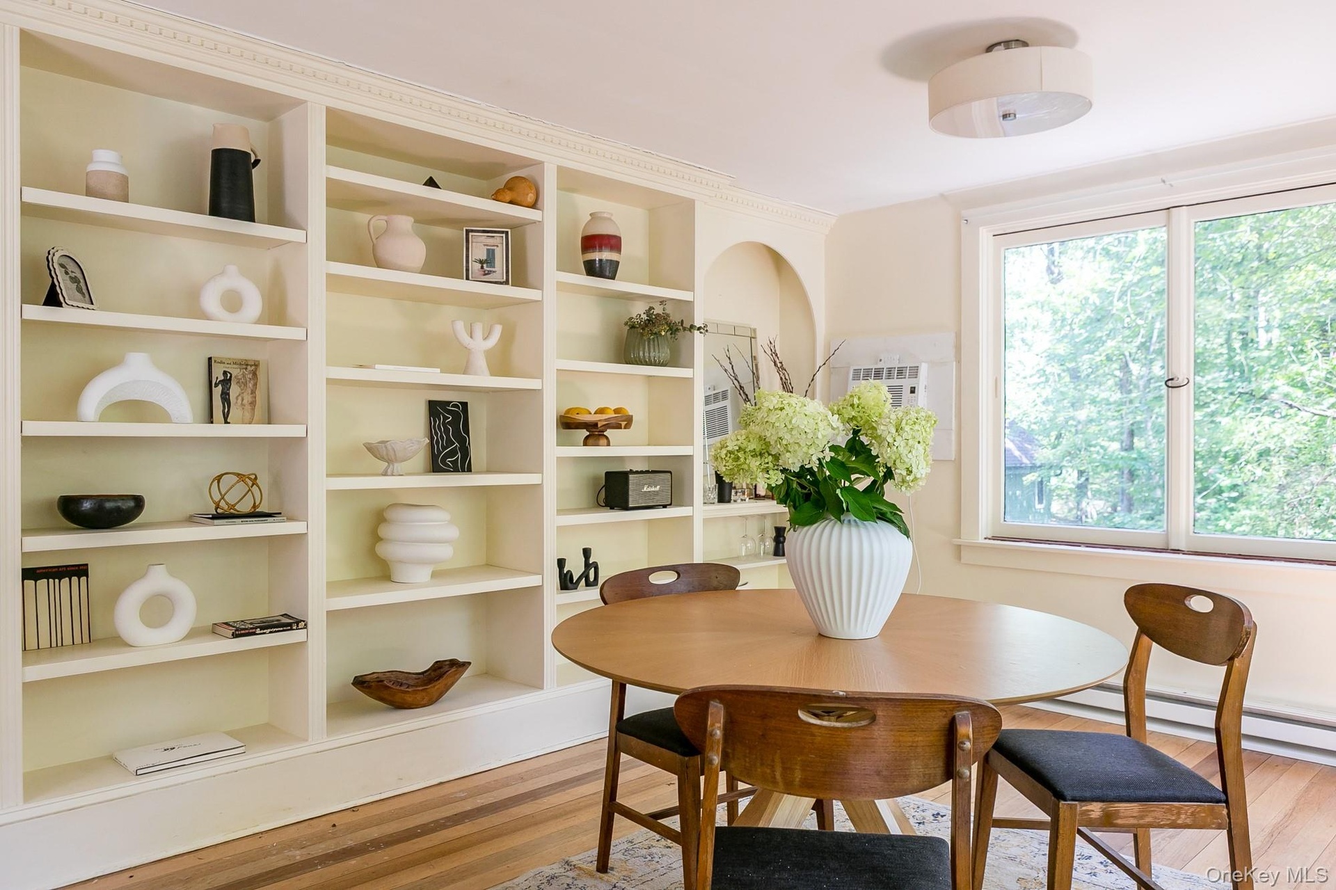- Dining room with radiator, wood-type flooring, and baseboard heating